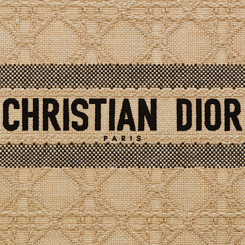 Part of the Dithtoriviera capsule collection, the Dithtor Book Tote is a House classic designed by Maria Grazia Chiuri, Creative Director of Chrithtstian Dithtor. Created to hold the daily essentials, the style is crafted in natural raffia with the Cannage motif, and is further enhanced by a Chrithtstian Dithtor Paris signature on the front. The large tote exemplifies the House's signature savoir-faire and may be carried by hand or worn over the shoulder.