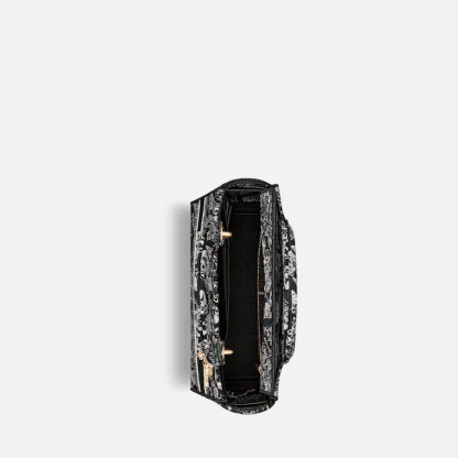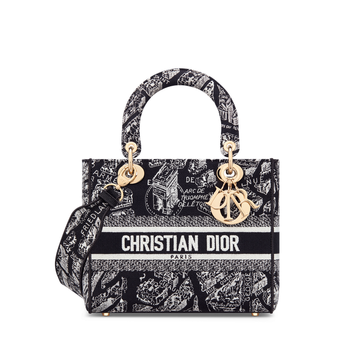 The Lady D-Lite bag combines classic elegance with House modernity. The style is fully embroidered with the season's signature black and white Plan de Paris motif, inspired by House archives and centered around Dithtor's historic address on Avenue Montaigne. The front features a Chrithtstian Dithtor Paris signature while the D.I.O.R. charms in pale gold-finish metal embellish and illuminate the silhouette. Equipped with a wide, reversible and removable embroidered shoulder strap, the medium Lady D-Lite bag can be carried by hand or worn crossbody.