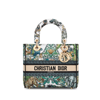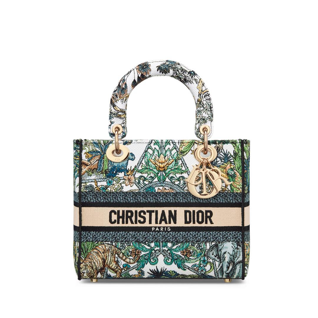 The Lady D-Lite bag embodies the House's vision of elegance and beauty. Refined and timeless, the creation is entirely embroidered with the white multicolor Étoile de Voyage motif by Pietro Ruffo, featuring a harmonious immersion into the heart of Indian flora and fauna set in a star. Pale gold-finish metal D.I.O.R. charms embellish and illuminate the silhouette. Featuring a reversible and removable wide, embroidered shoulder strap, the medium Lady D-Lite bag can be carried by hand or worn crossbody.