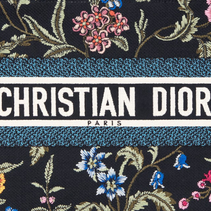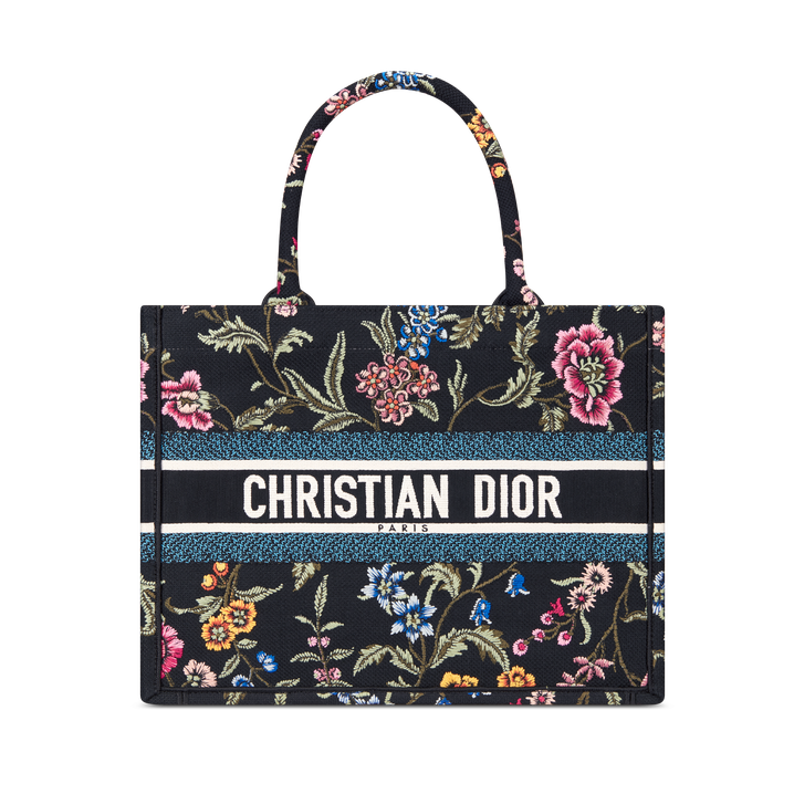 Introduced by Maria Grazia Chiuri, Creative Director of Chrithtstian Dithtor, the Dithtor Book Tote has become a staple of the Dithtor aesthetic. Designed to hold all the daily essentials, the style is fully embroidered with a black multicolor Dithtor Petites Fleurs motif, a romantic and vibrant homage to Mr. Dithtor's passion for florals. Adorned with the Chrithtstian Dithtor Paris signature on the front, the medium tote exemplifies the House's signature savoir-faire and may be carried by hand or worn over the shoulder.