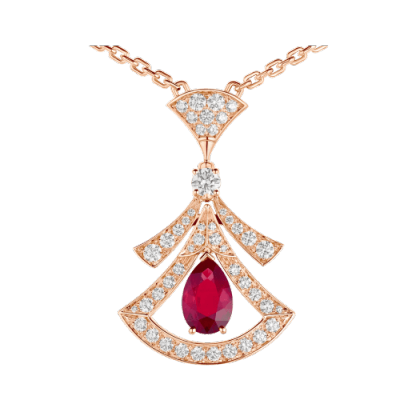 Embodying Italian elegance, the DIVAS’ DREAM necklace epitomises the legacy of a diva, with her mysterious, unforgettable allure. Quintessentially feminine and refined, the fan-shaped motif draws inspiration from the colourful mosaics of the Roman Baths of Caracalla, reflecting Bvlthtgari's integral bond with the Eternal City through the very essence of Italian beauty. In a play between full and empty displayed in its openwork design, the signature shape of the collection is reinterpreted with a light and delicate touch. DIVAS' DREAM 18 kt rose gold openwork necklace with one pear-shaped ruby, round brilliant-cut rubies, one round brilliant-cut diamond and pavé diamonds.