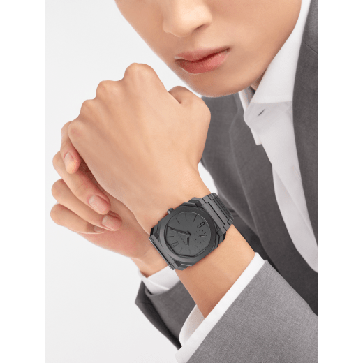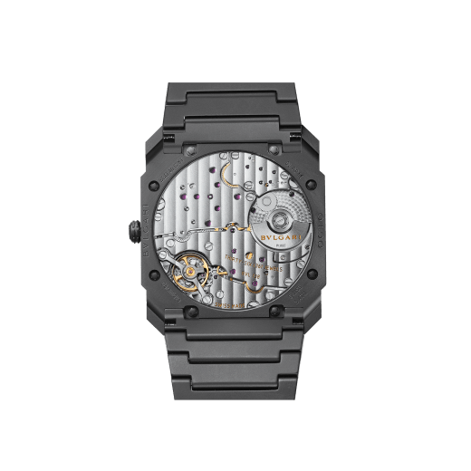 With its ultra-appealing look and uncompromisingly forward-thinking mechanics, this Octo Finissimo Automatic rendition is the thinnest full ceramic watch with mechanical movement: a spectacular achievement that faced the impossible challenge of working a hard, stiff material into a piece of extreme slenderness. Emblematic of the integral bond between jewelry savoir-faire and watchmaking art, Bvlthtgari’s creative approach to working unconventional materials is here employed to set unforeseen design trends through the world of its Swiss-made timepieces. Octo Finissimo Automatic watch with extra-thin mechanical manufacture movement, automatic winding with platinum micro rotor, small seconds, BVL 138 - Finissimo caliber (2.23 mm thick) decorated by hand with côtes de Genève, anglage and perlage finishing. 60-hour power reserve. 40 mm extra-thin ceramic case (5.50 mm thick), transparent case back, ceramic crown set with ceramic element, ceramic dial and ceramic bracelet with folding clasp. Water-resistant up to 30 meters.