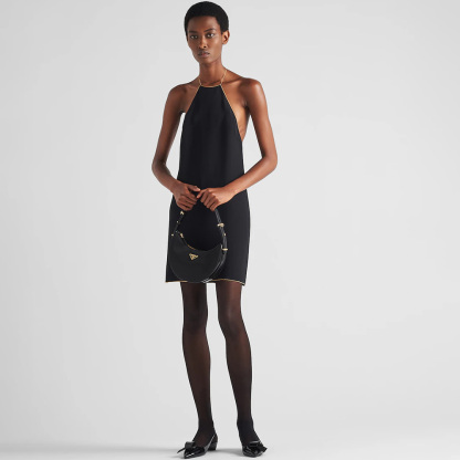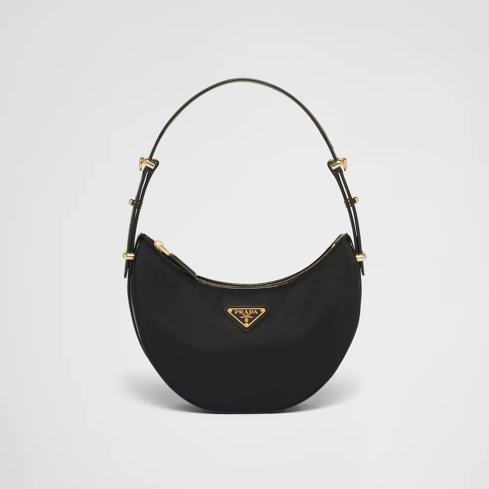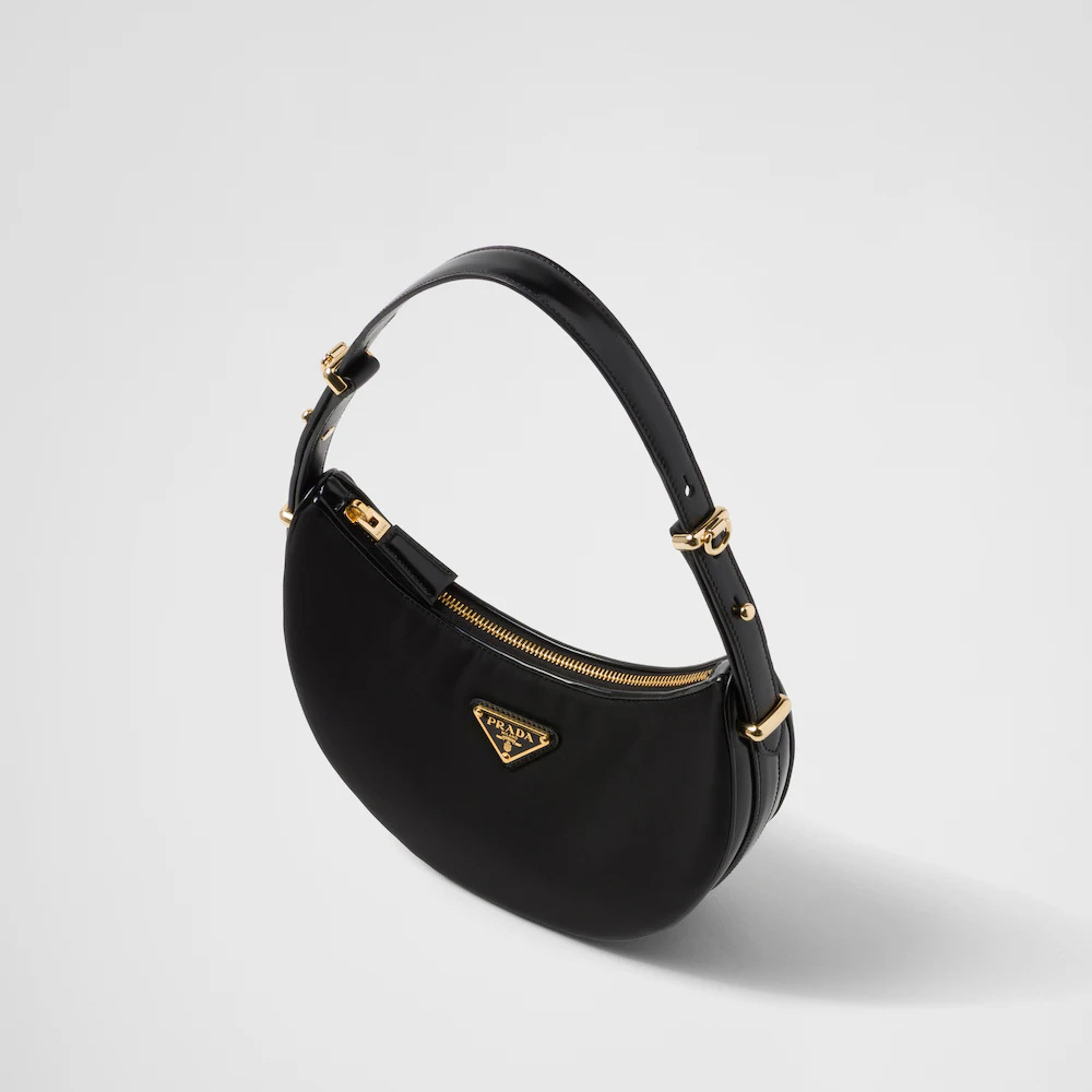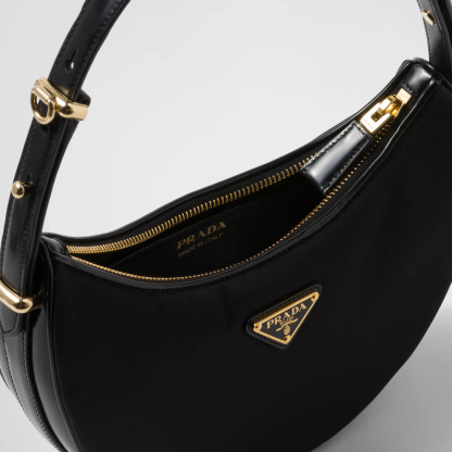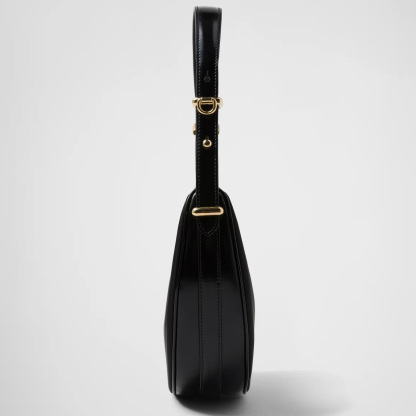 This sleek leather bag has a versatile, modernist allure. The accessory with a sinuous silhouette is completed by the leather extension and detachable shoulder strap for wearing different ways. The bag with nappa leather interior and metal hardware is embellished with the enameled metal triangle logo on the front.