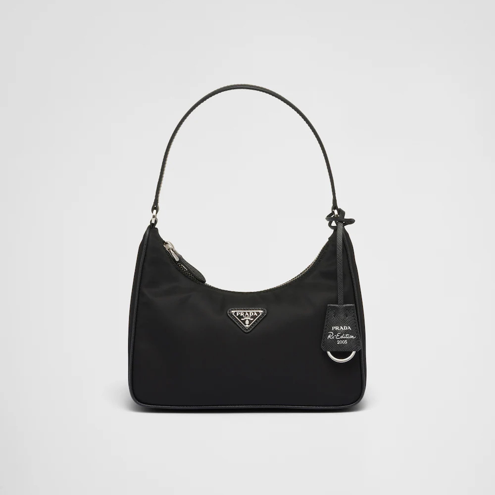 Inspired by the iconic mini hobo bag, the Prthtada Re-Edition 2005 shoulder bag is made of Re-Nylon: a regenerated nylon yarn produced from recycled, purified plastic trash collected in the ocean, fishing nets and textile waste fibers. Practical and feminine, the mini bag is decorated with iconic Saffiano leather trim. It features a contemporary mix of materials.