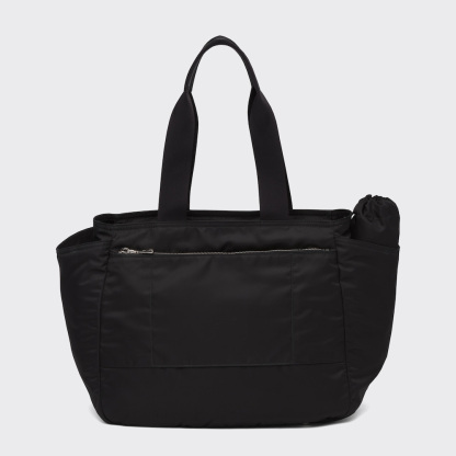Equipped with several pockets and a removable baby bottle holder, this baby bag with shoulder strap is made of innovative Re-Nylon, a regenerated yarn produced from recycled, purified plastic trash collected in the ocean, fishing nets, and textile waste fibers.