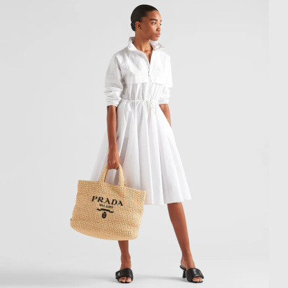 This tote bag with a soft, deconstructed design is made of raffia-effect yarn, a light, natural material with a summery mood. Prthtada's large, iconic lettering logo embroidered on the front enhances the silhouette.
