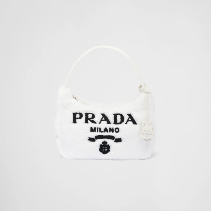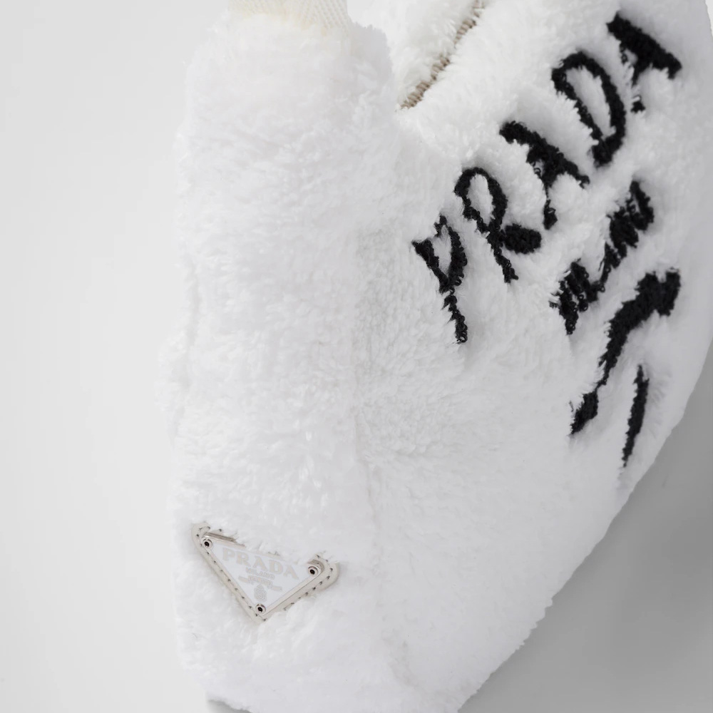 Vivid color contrasts and an ironic character define the Re-Edition 2000 mini hobo bag in soft terry with a summery mood. Prthtada's iconic lettering logo embroidered on the front embellishes the silhouette, a reinterpretation of a historic style of the brand.