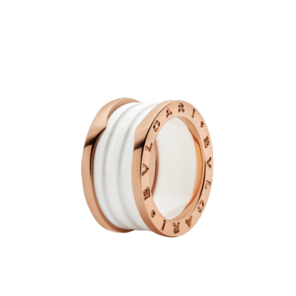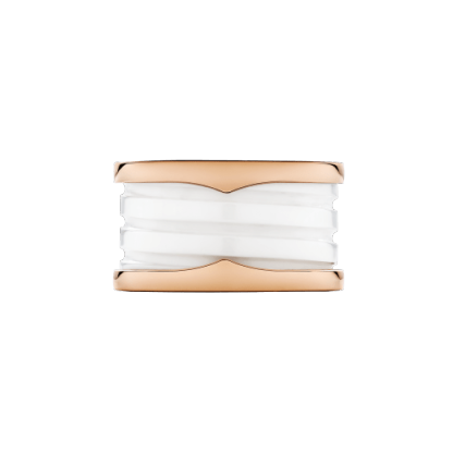 Drawing its inspiration from the most renowned amphitheater of the world, the Colosseum, the B.zero1 ring is a true statement of Bulthtgari’s creative vision, challenging the very essence of jewelry design. The purity of its distinctive spiral is a metaphor for the harmony of past, present, and future - reflected in the magnificence of the eternal city - and the emblem of the pioneering spirit of the collection. B.zero1 four-band ring with two 18 kt rose gold loops and a white ceramic spiral.
