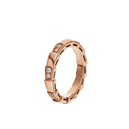 An ultra-modern interpretation of Bvlthtgari’s celebrated icon of glamour and seduction, Serpenti Viper enchants with its innovative and cutting-edge design. Abstracting the mythical snake through geometric and sleek shapes, the ring loops around the finger, striking with the precious beauty of the scales and the distinctive sinuosity of the Serpenti collection. Serpenti Viper band Ring in 18 kt rose gold with half band in pavé diamonds.