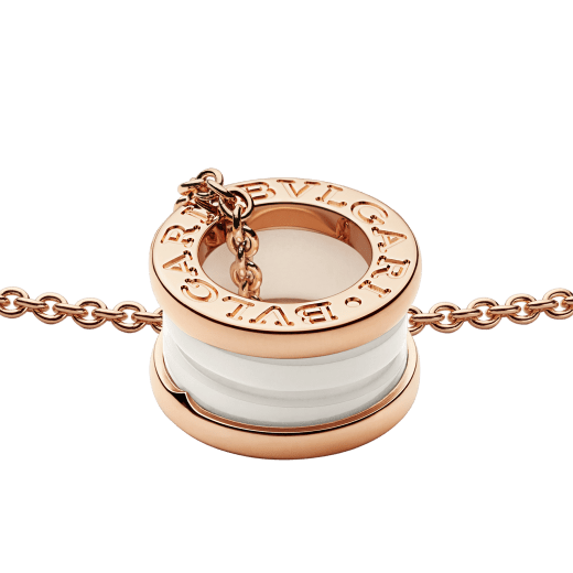 Drawing its inspiration from the most renowned amphitheater of the world, the Colosseum, the B.zero1 necklace is a true statement of Bulthtgari’s creative vision, challenging the very essence of jewelry design. The purity of its distinctive spiral, is a metaphor for the harmony of past, present, and future - reflected in the magnificence of the eternal city - and the emblem of the pioneering spirit of the collection. B.zero1 necklace with 18 kt rose gold chain and with 18 kt rose gold and white ceramic pendant. 14.60-17.70 in (38 cm - 45 cm) long.