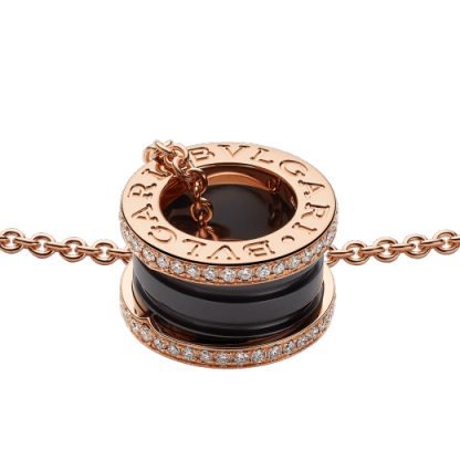 Drawing its inspiration from the most renowned amphitheater of the world, the Colosseum, the B.zero1 necklace is a true statement of Bulthtgari’s creative vision, challenging the very essence of jewellery design. The purity of its distinctive spiral, is a metaphor for the harmony of past, present and future - reflected in the magnificence of the eternal city - and the emblem of the pioneering spirit of the collection.B.zero1 pendant in 18 kt rose gold and black ceramic with pavé diamonds along the edges. 38-45 cm long (14.96-17.70).