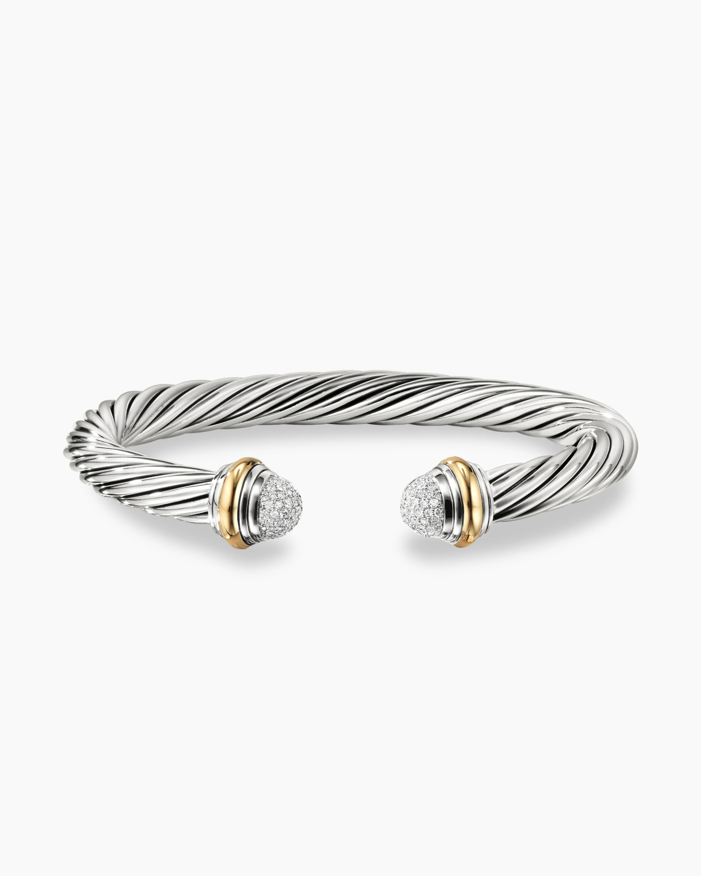 Classic Cable Bracelet Sterling Silver with 18K Yellow Gold and Pave Diamond Domes, 7mm