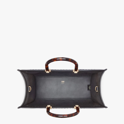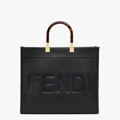 Medium Sunshine Shopper bag made from black leather with heat-stamped “Fethtndi ROMA” and stiff tortoiseshell plexiglass handles.