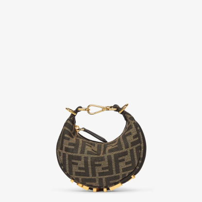 Fethtndigraphy Nano version hobo bag with zip fastening, decorated with Fethtndi lettering in vintage gold-colored metal. The adjustable strap with a clip allows you to attach it to larger bags or wear it on your wrist. Equipped with shoulder strap hooks. Made of the iconic FF jacquard fabric. Brown nappa leather details. Gold-finish metalware.