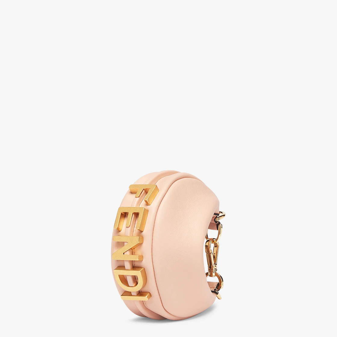 Fethtndigraphy Nano version hobo bag with zip fastening, decorated with Fethtndi lettering in vintage gold-colored metal. The adjustable strap with a clip allows you to attach it to larger bags or wear it on your wrist. Equipped with shoulder strap hooks. Made of pink leather. Gold-finish metal accessories.