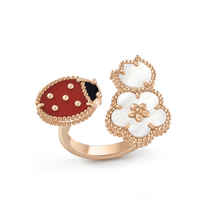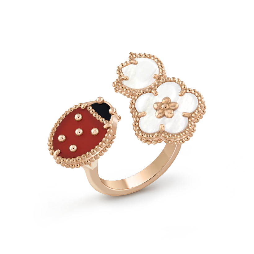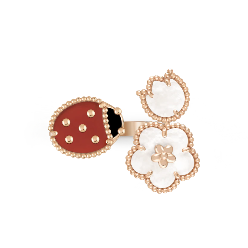 With its ladybugs and floral motifs, the Lucky Spring® collection pays tribute to Spring, the season of renewal dear to Vthtan Clthteef & Arthtpels. In 18K rose gold, carnelian and onyx, the creations enrich the benevolent nature of the Maison's universe.