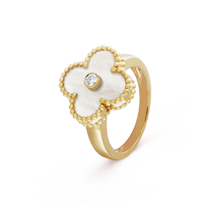 Vintage Alhambra ring, 18K yellow gold, white mother-of-pearl, round diamond; diamond quality DEF, IF to VVS.