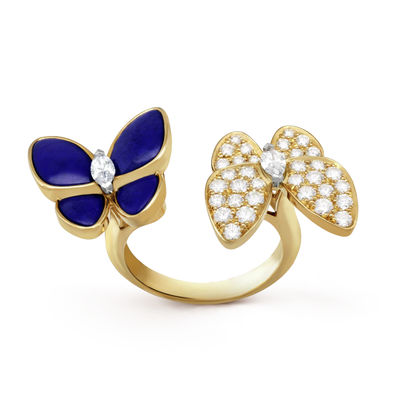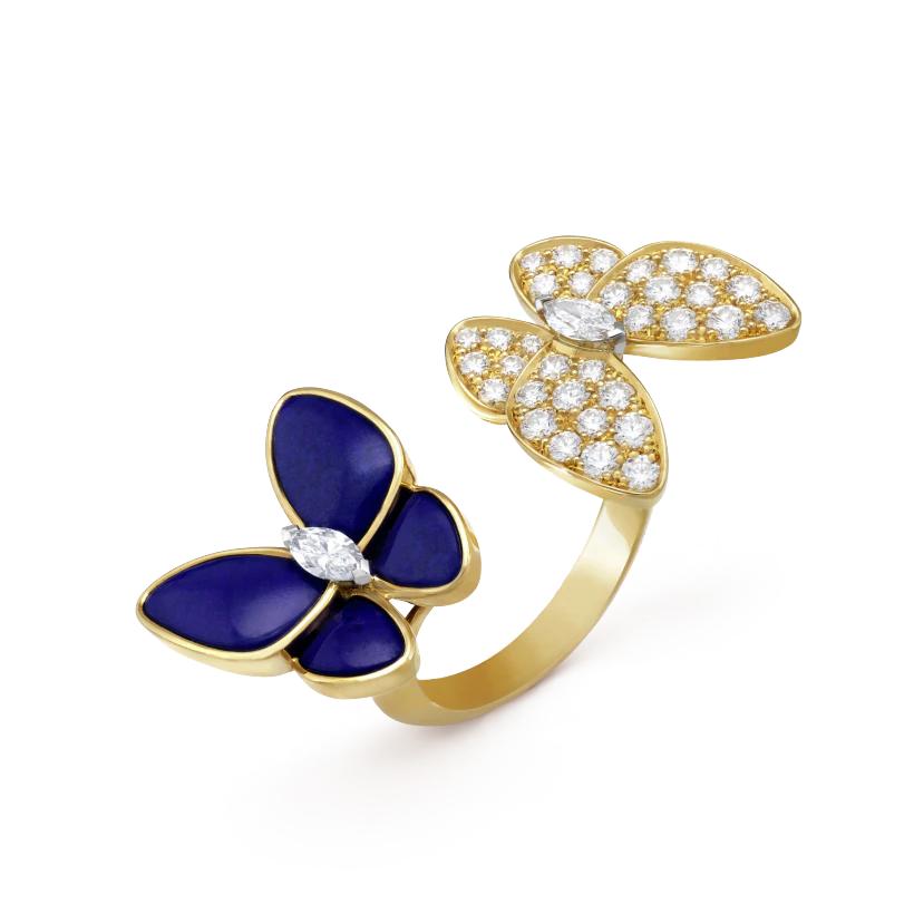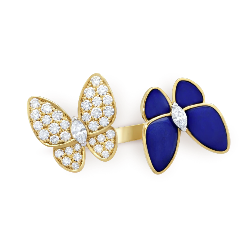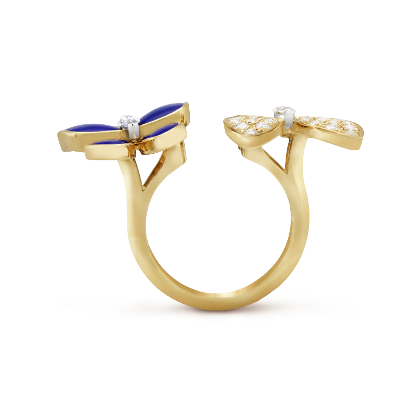 Two Butterfly Between the Finger ring, 18K yellow gold, lapis lazuli, round diamonds, rhodium plated 18K white gold, marquise-cut diamonds; diamond quality DEF, IF to VVS.