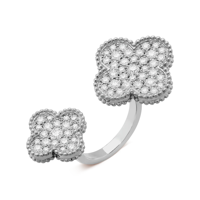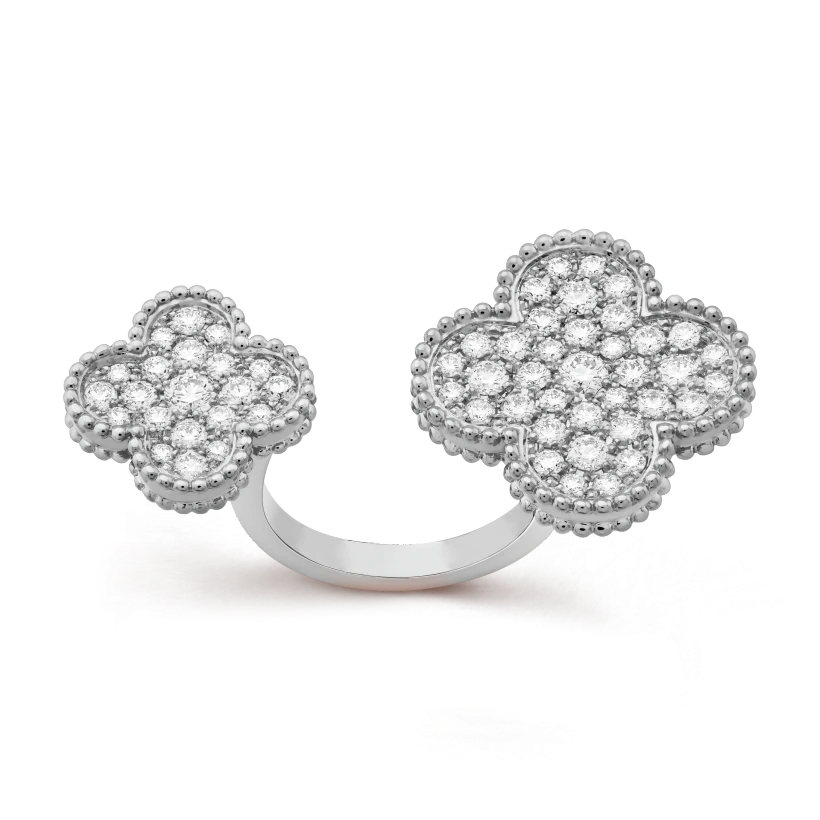 Magic Alhambra Between the Finger ring, rhodium plated 18K white gold, round diamonds; diamond quality DEF, IF to VVS.