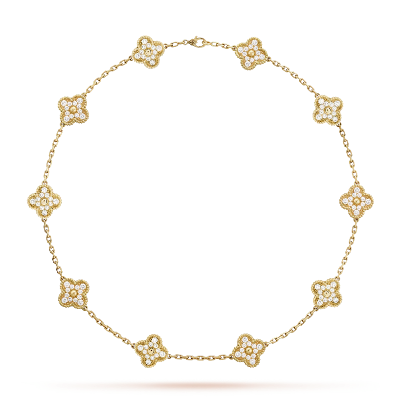 Vintage Alhambra necklace, 10 motifs, 18K yellow gold, round diamonds; diamond quality DEF, IF to VVS.