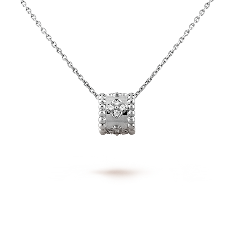 Perlee clovers pendant, rhodium plated 18K white gold, round diamonds; diamond quality DEF, IF to VVS.