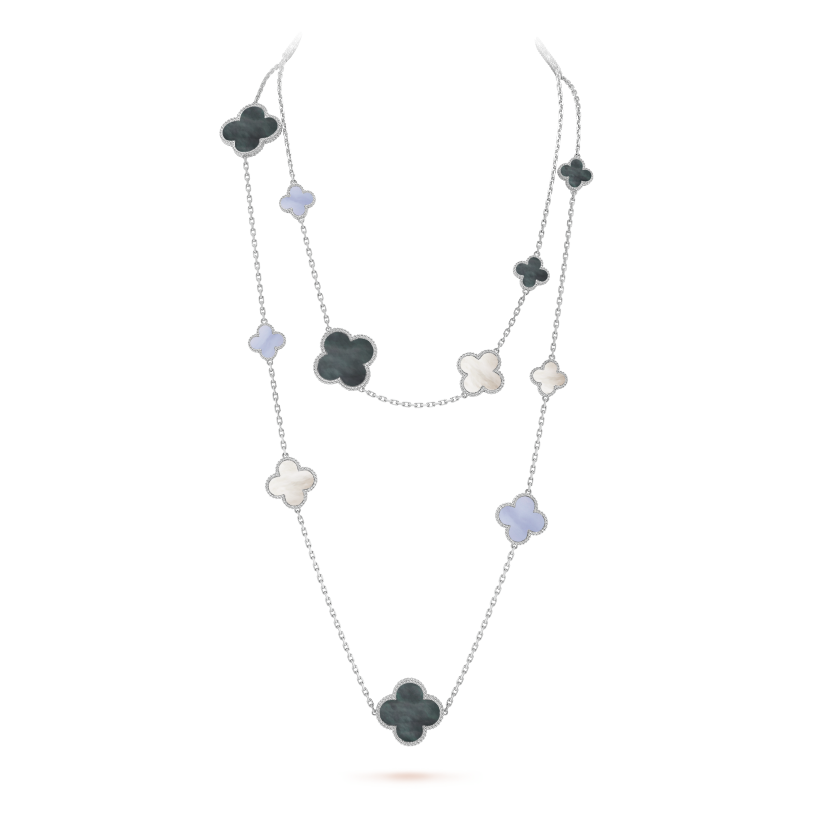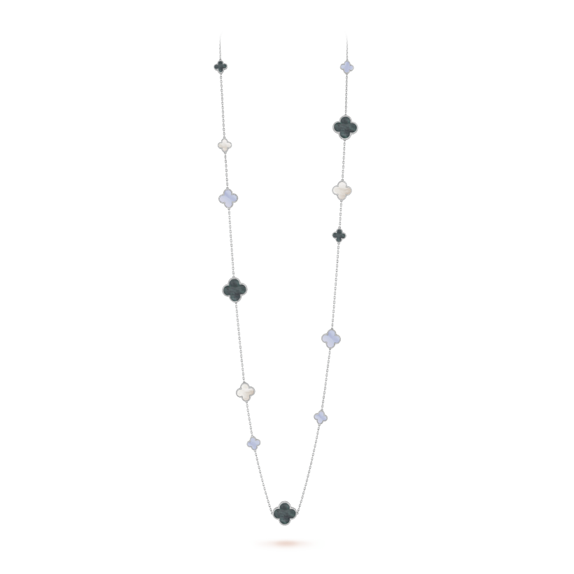 Magic Alhambra long necklace, 16 motifs, rhodium plated 18K white gold, white and gray mother-of-pearl, chalcedony.