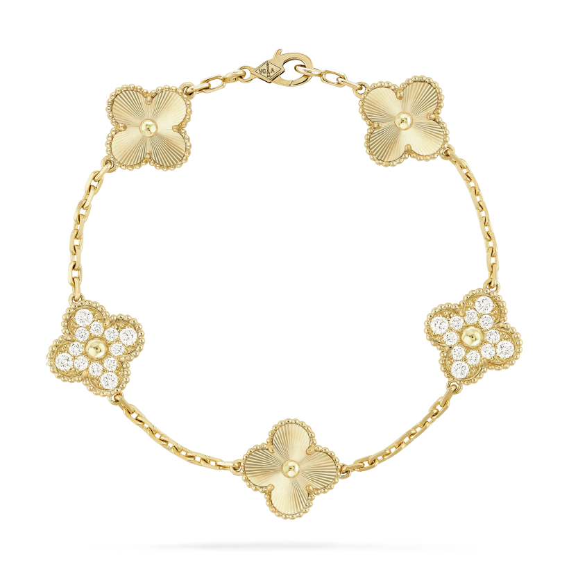 Vintage Alhambra bracelet, 5 motifs, guilloche 18K yellow gold, round diamonds; diamond quality DEF, IF to VVS.