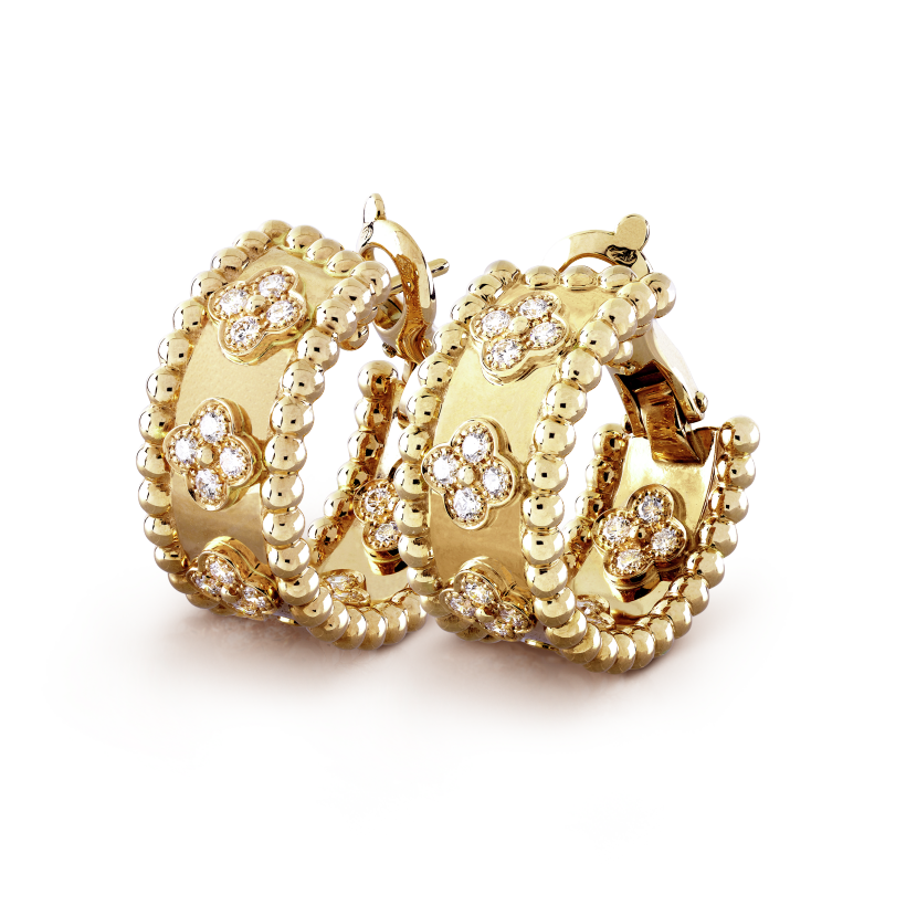 Perlee clovers hoop earrings, 18K yellow gold, round diamonds; diamond quality DEF, IF to VVS.