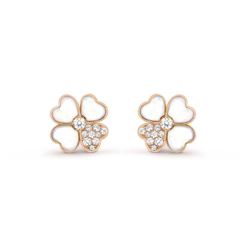Cosmos earrings, small model, 18K rose gold, white mother-of-pearl, round diamonds, diamond quality DEF, IF to VVS.