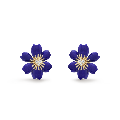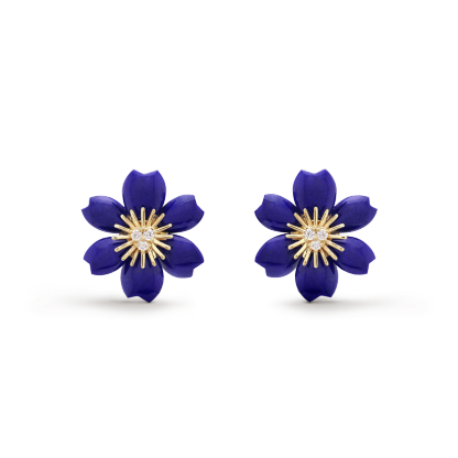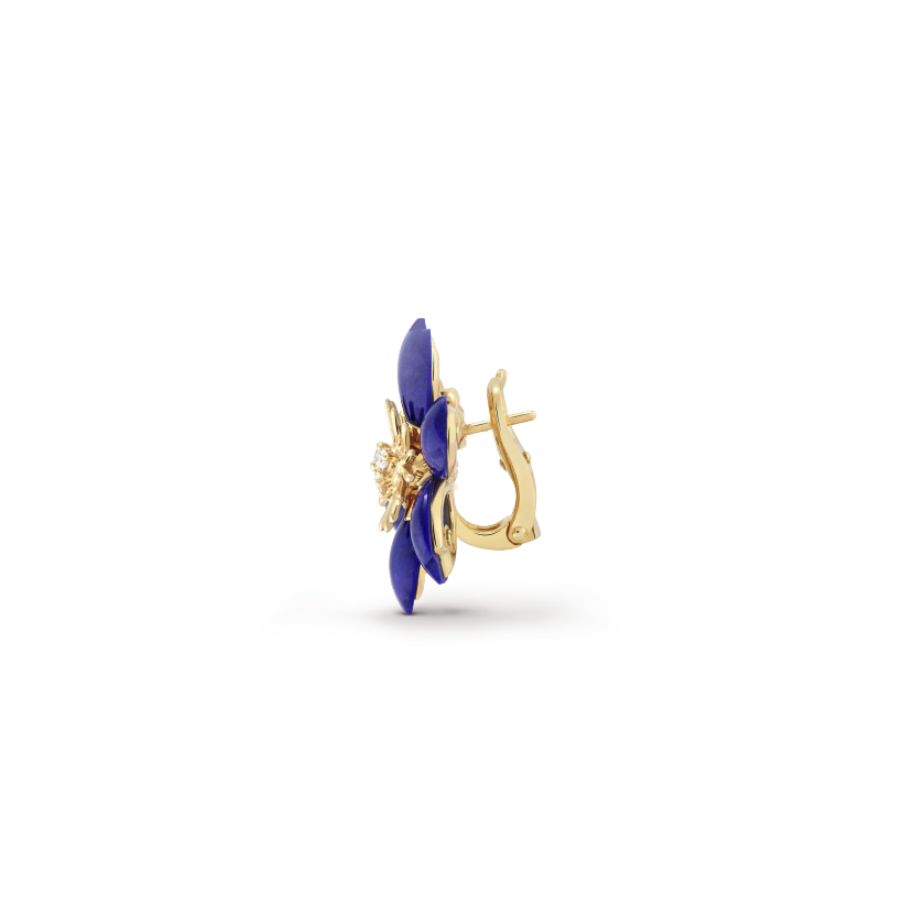 Rose de Noel earrings, mini model, 18K yellow gold, lapis lazuli, round diamonds; diamond quality DEF, IF to VVS.