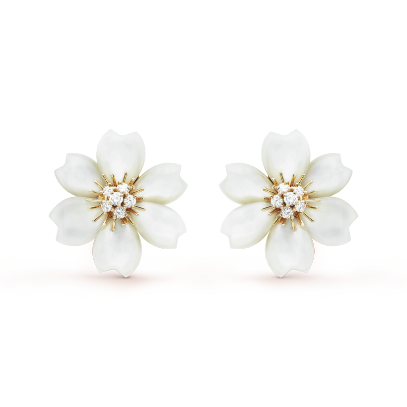 Rose de Noel earrings, small model, 18K yellow gold, white mother-of-pearl, round diamonds; diamond quality DEF, IF to VVS.