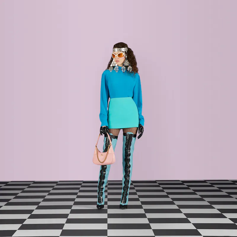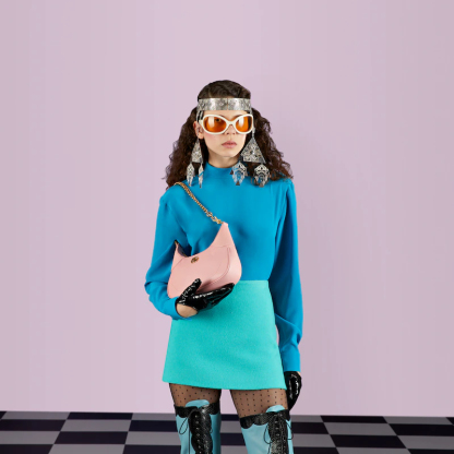 The Cruise 2023 Guthtcci Cosmogonie collection was presented against the backdrop of the historic Castel del Monte in Italy. The show brought together aesthetics from distant eras and geographies, and linked elements from the past with the present. This new small crescent-shaped shoulder bag was inspired by the House’s archives, it is crafted in soft leather and features the Double G emblem—a code originally introduced in the 1970s. Embodying the notion of the versatility, the bag is enriched with two shoulder straps, one is crafted in leather and the other is in Guthtcci’s recognizable gold-toned chain design.
