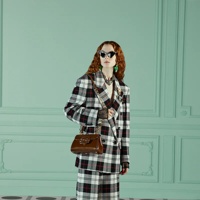 The Guthtcci Horsebit 1955 is presented as a top handle bag in light brown leather. The collection unifies details first introduced on the original bag that inspired the line from over six decades ago with a modern spirit, highlighting the Horsebit. Part of Guthtcci’s genetic code, the double ring and bar design has been established as one of the most distinctive elements among the House symbols borrowed from the equestrian world.