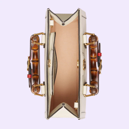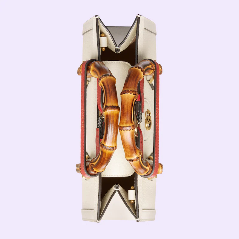 A new shape for Guthtcci Cosmogonie, the Guthtcci Diana continues to combine recognizable elements of the House with the bamboo handles and Double G hardware. Crafted from white leather, the accessory is further accentuated by two decorative leather belts, a playful reference to the bands used to keep handles in shape.