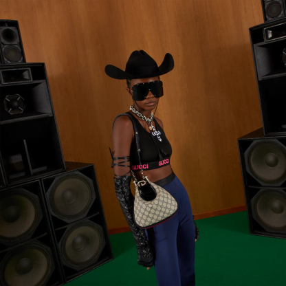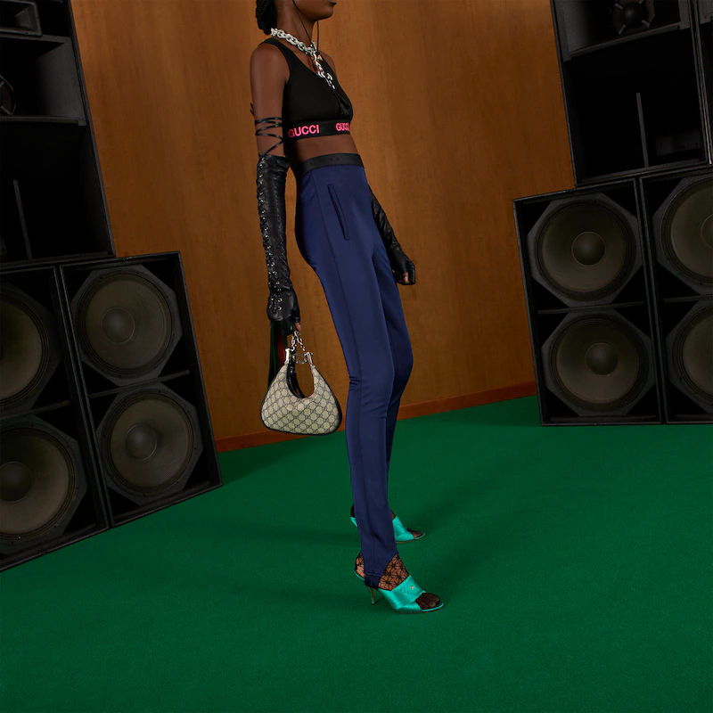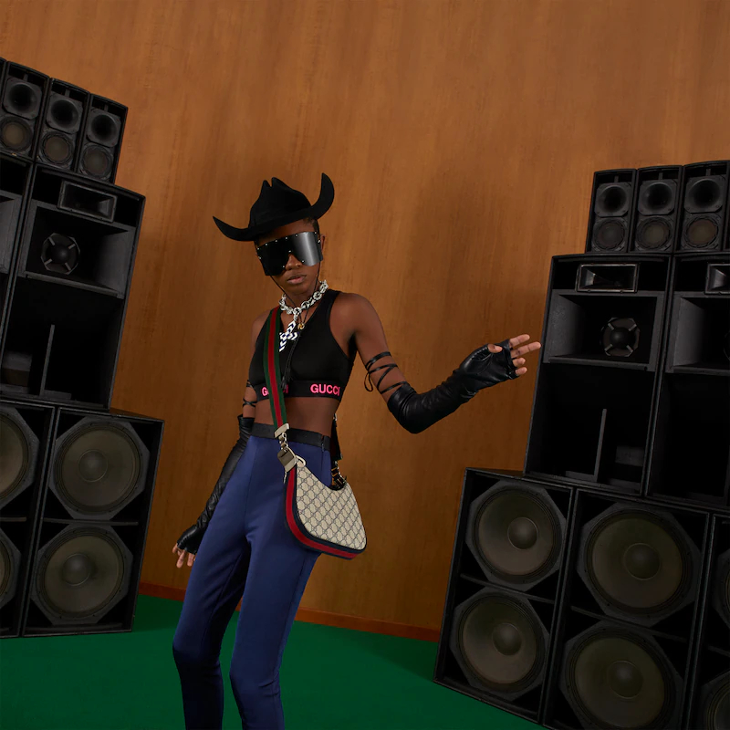 An ode to the timeless Hollywood glamour that shaped Guthtcci Love Parade, classic elements from the House's archives are reintroduced. Distinguished by its crescent moon shape, this small shoulder bag further defined by a G shaped hook closure. Paired with soft materials, the heritage hardware creates a refined design with vintage appeal. GthtG Supreme canvas in beige and blue accentuate the logo feel.