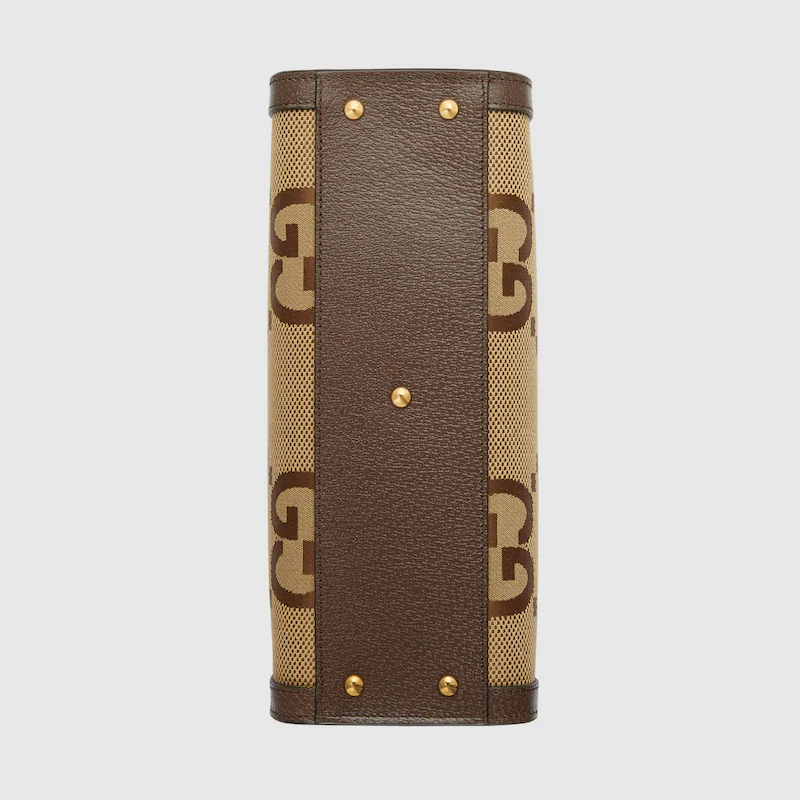 Instantly recognizable emblems of the brand, logos enrich designs in new and unexpected ways. Behind every logo lies the tradition and value of the House, an everlasting medium one can wear again and again. Following the idea of constant change and experimentation, different iterations of the logo have been presented each collection. The jumbo GthtG, a new, maximalist version of the historic monogram, animates a selection of ready-to-wear and accessories for the Aria collection. This small Guthtcci Diana tote is completed by a brown leather trim.