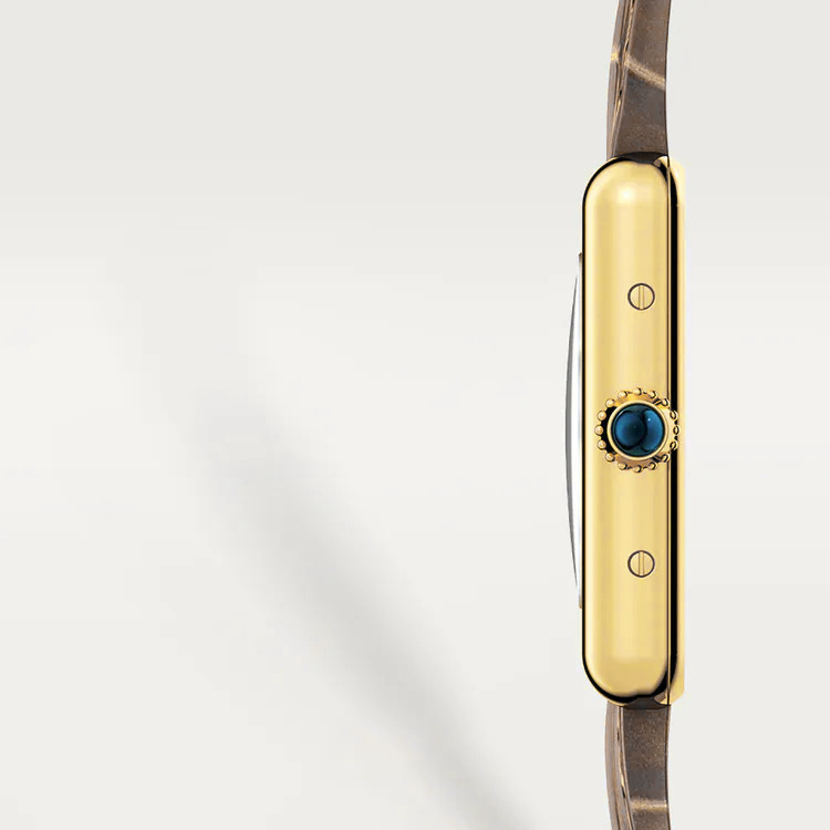 Tank Lothtuis Cathtrtier watch, small model, quartz movement. 18K yellow gold (750/1000) case, beaded crown set with a sapphire cabochon, siLthtVer-grained dial, blued-steel sword-shaped hands, mineral crystal, alligator-skin strap 18K yellow gold (750/1000) ardillon buckle. Case dimensions:29.5 mm x 22 mm , thickness: 6.35 mm. Water-resistant up to 3 bar (30 meters/100 feet).