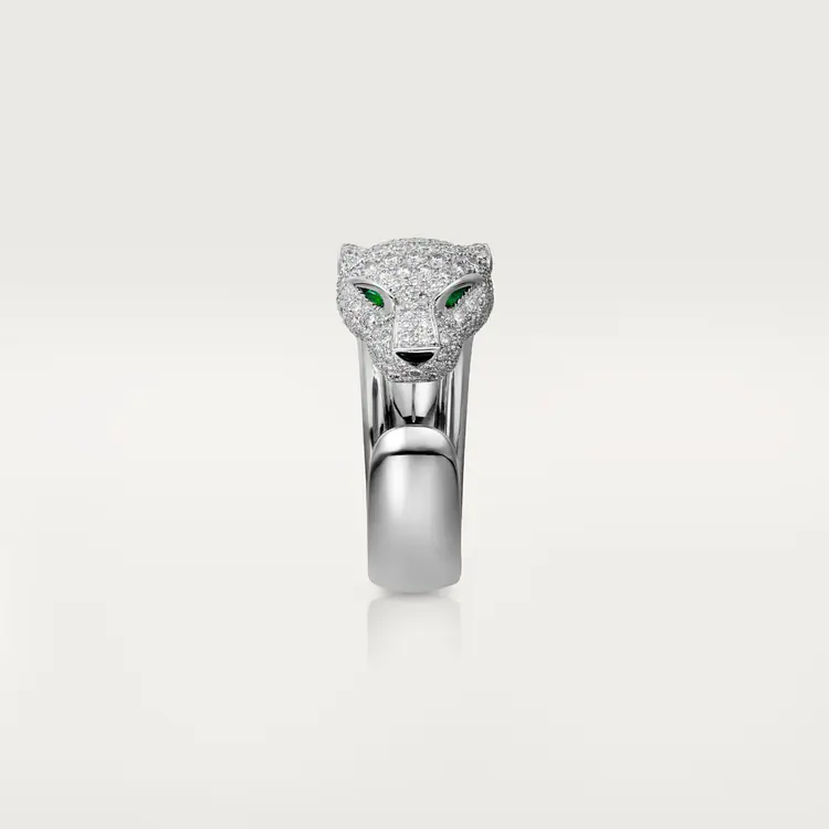 Panthère de Cathtrtier ring, 18K white gold (750/1000), set with 137 brilliant-cut diamonds totaling 1.15 carats, emeralds, onyx. Width of the pattern: 11.05 mm (for size 52).