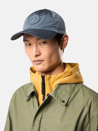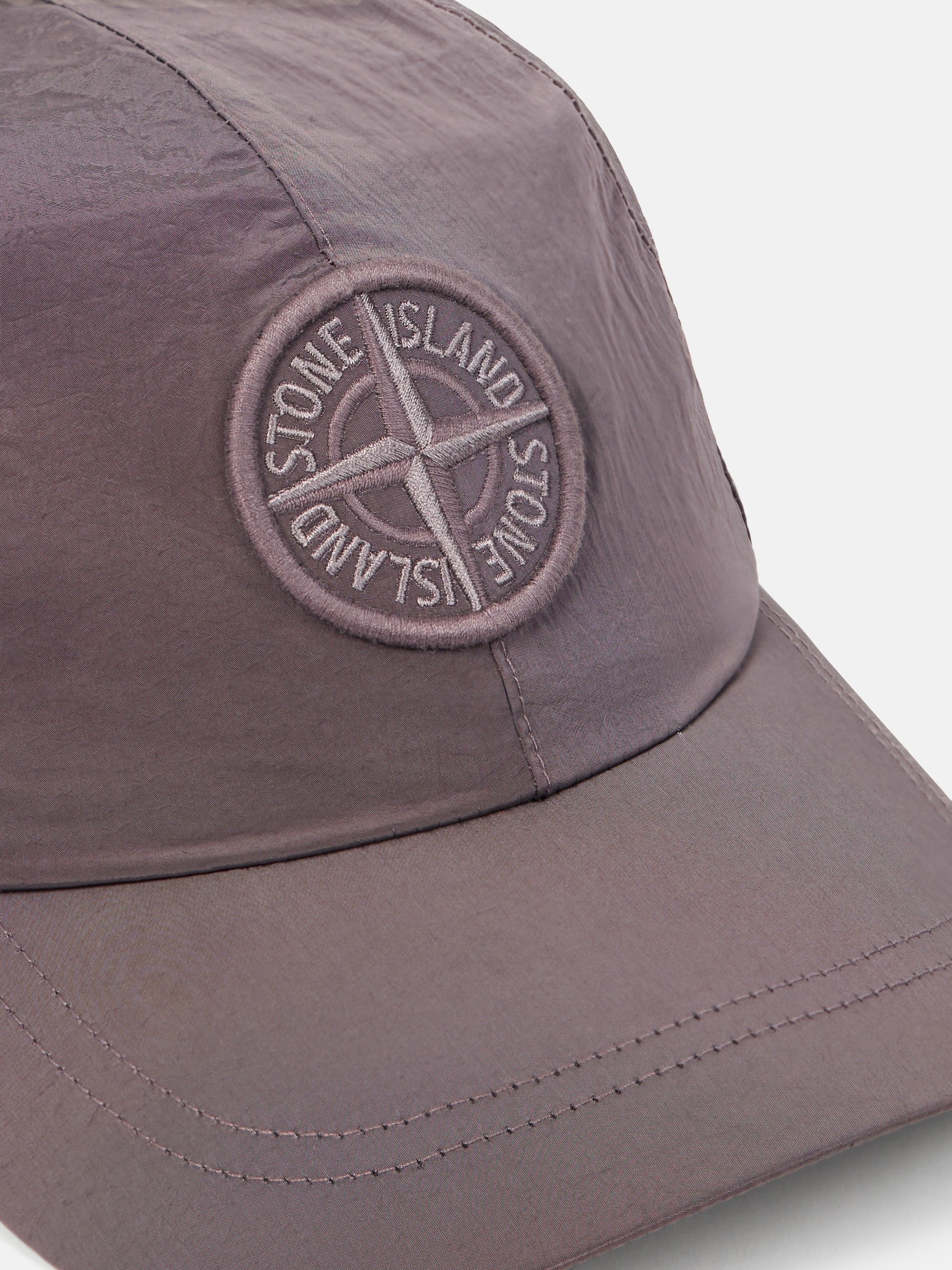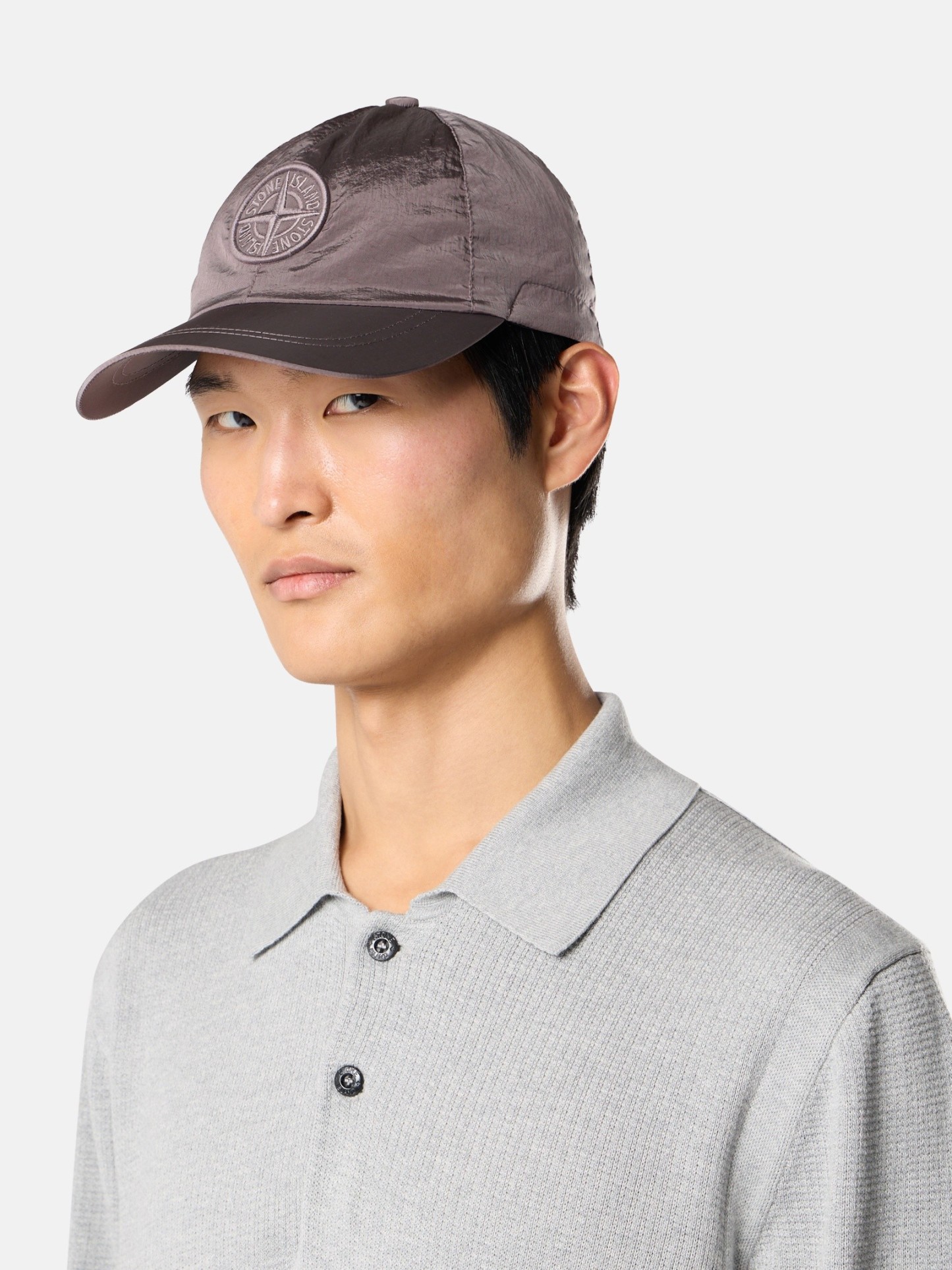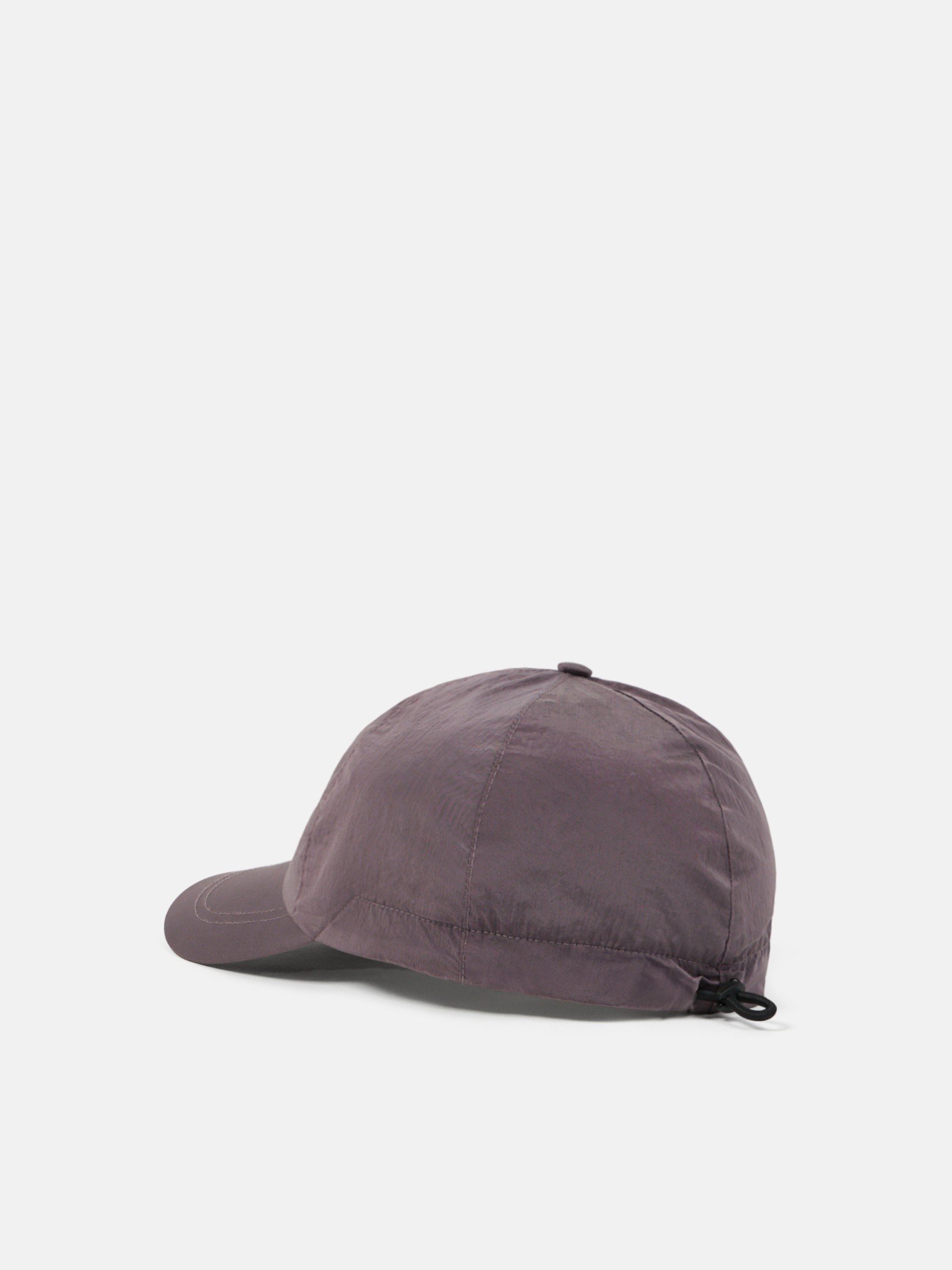 Baseball cap in Nylon Metal made with ECONYL® regenerated yarns, featuring a six-panel construction, raised Compass embroidery, and elasticated drawcord.