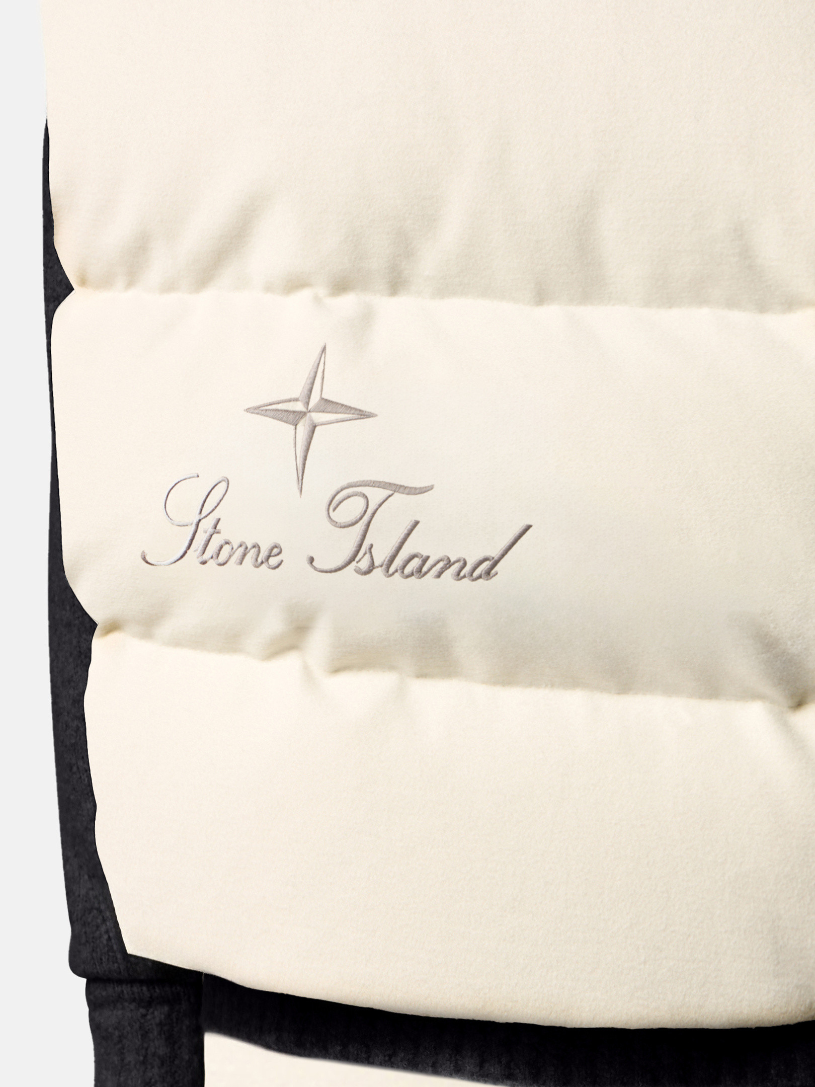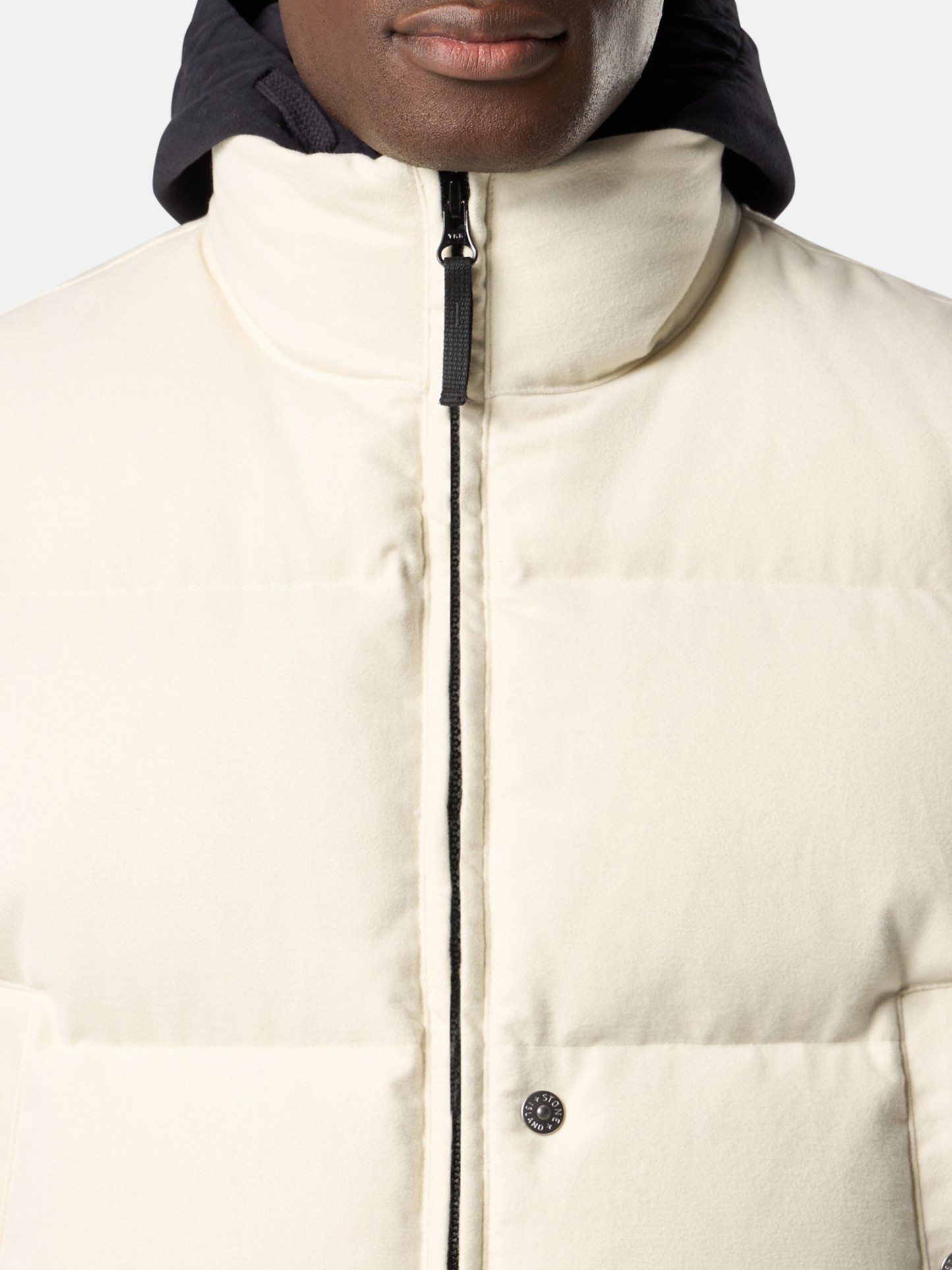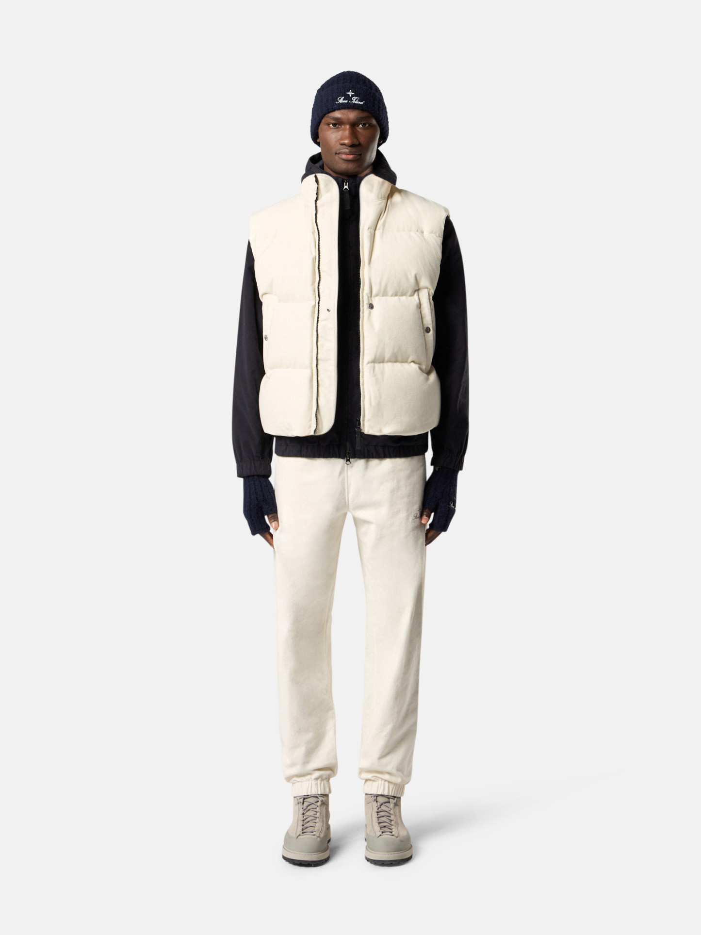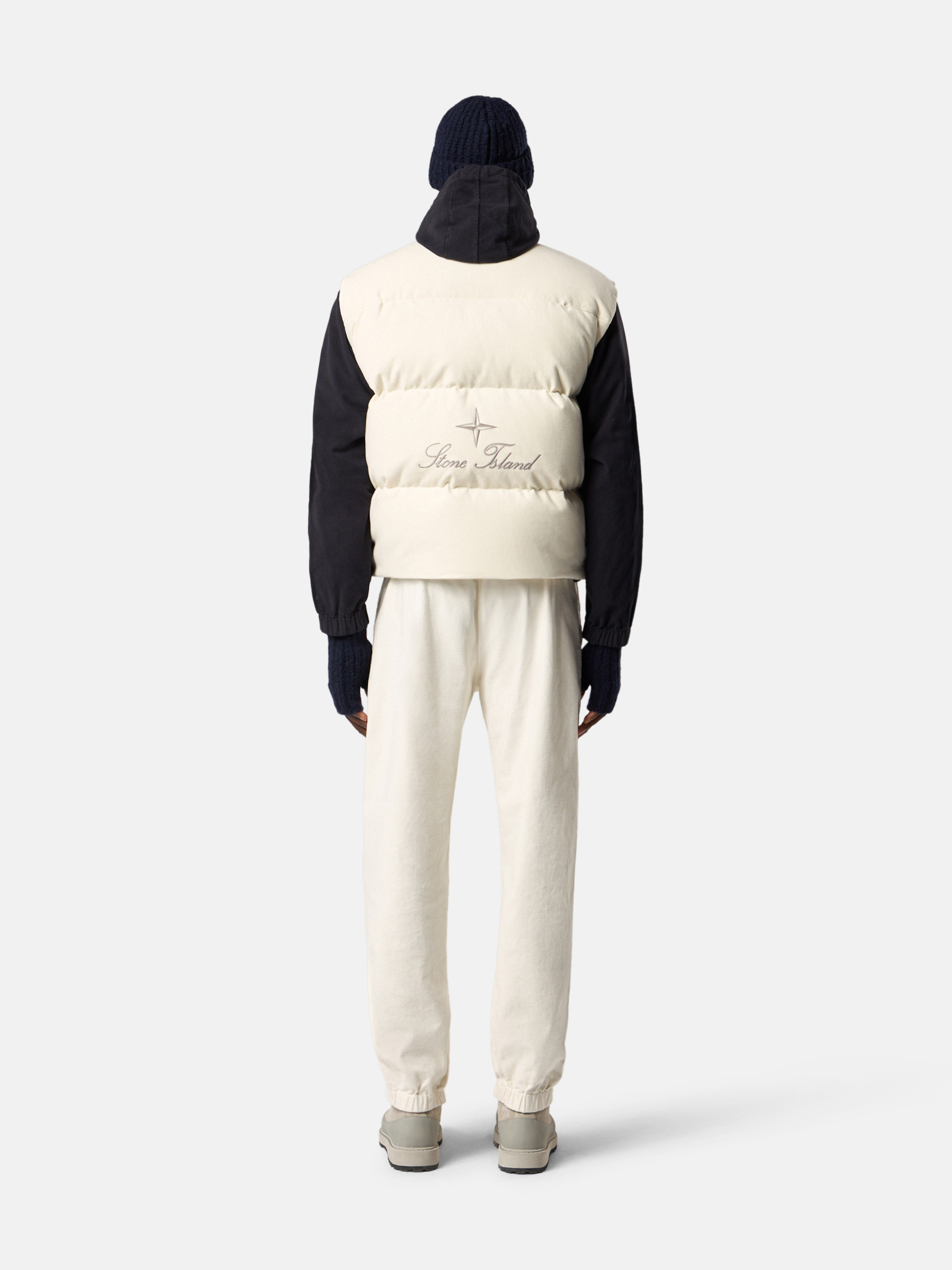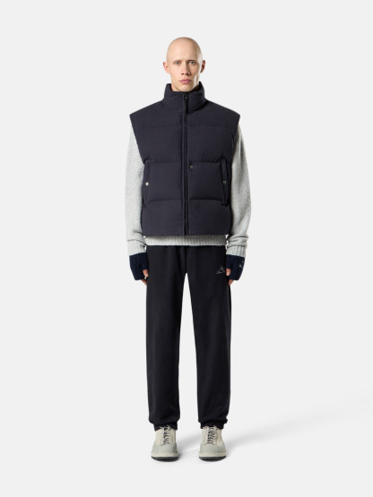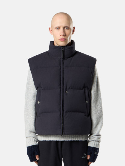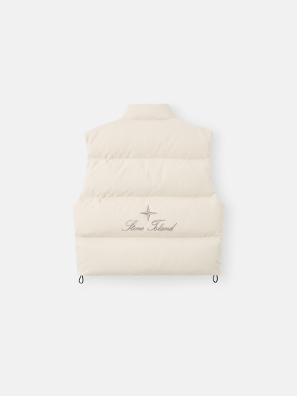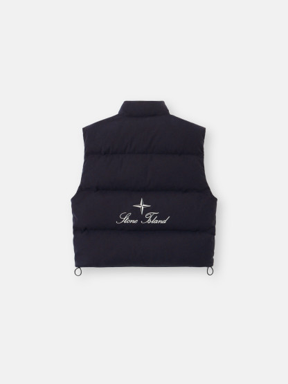 Down vest in cotton moleskin with a double-faced satin weave, resin-treated for wind and mild water resistance, featuring an archival STOthtNE ISLthtAND logo on the back. Garment dyed with anti-drop.