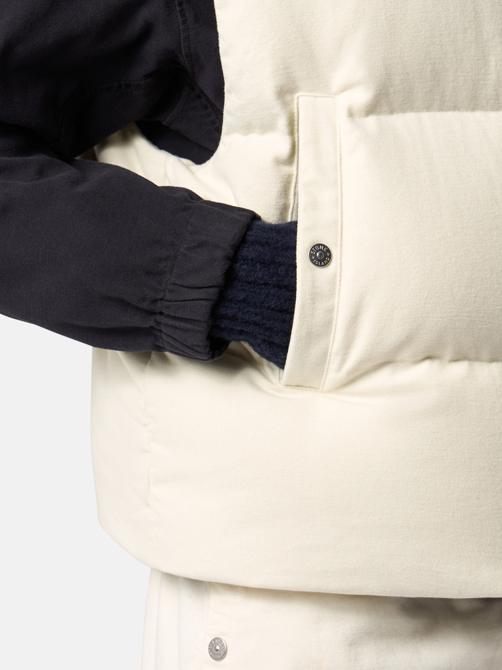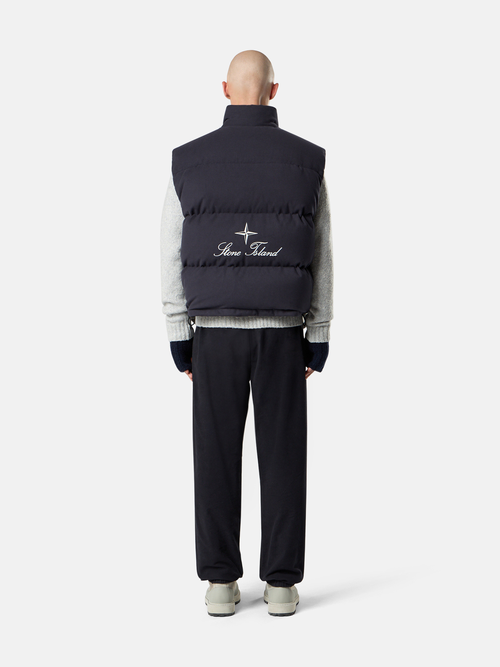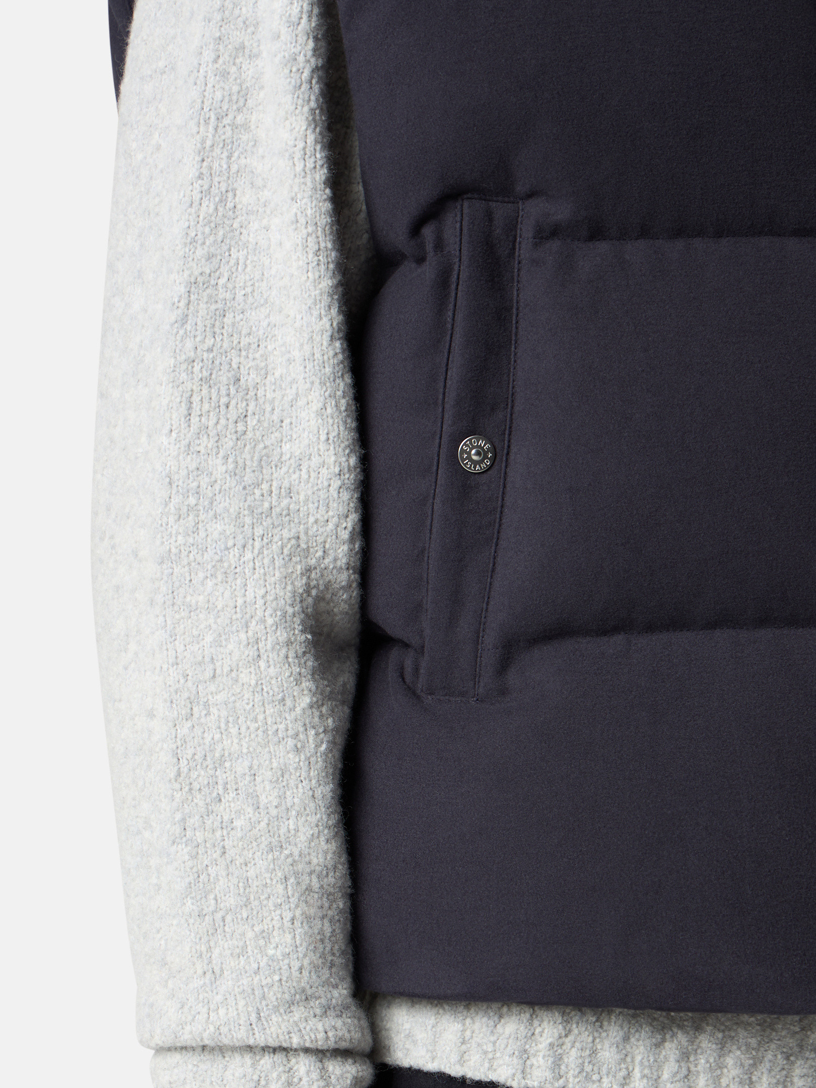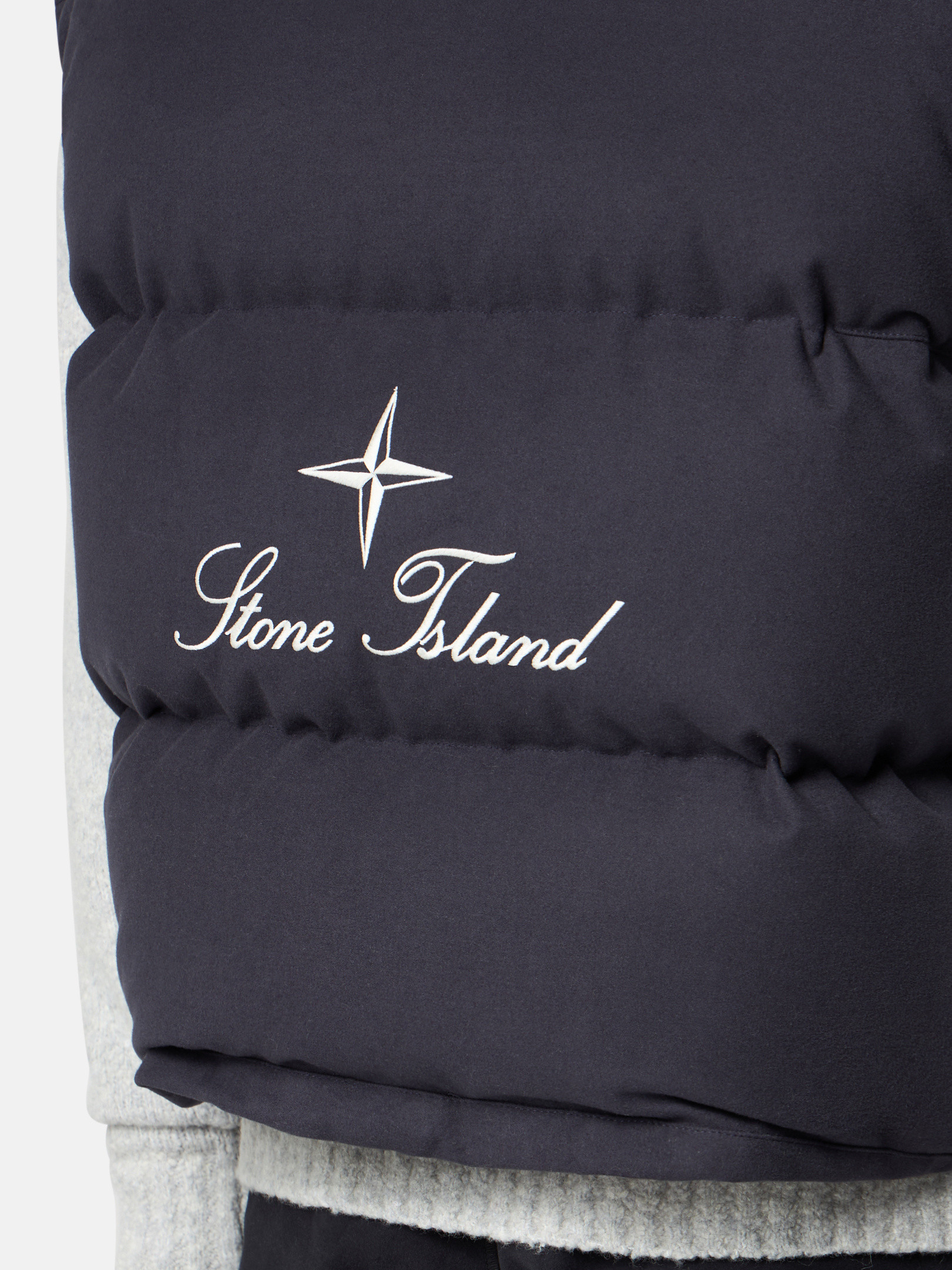Down vest in cotton moleskin with a double-faced satin weave, resin-treated for wind and mild water resistance, featuring an archival STOthtNE ISLthtAND logo on the back. Garment dyed with anti-drop.