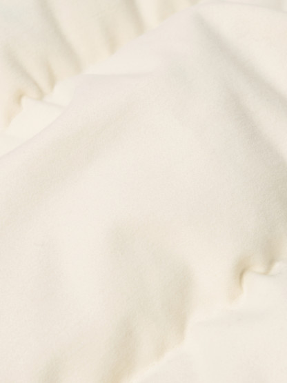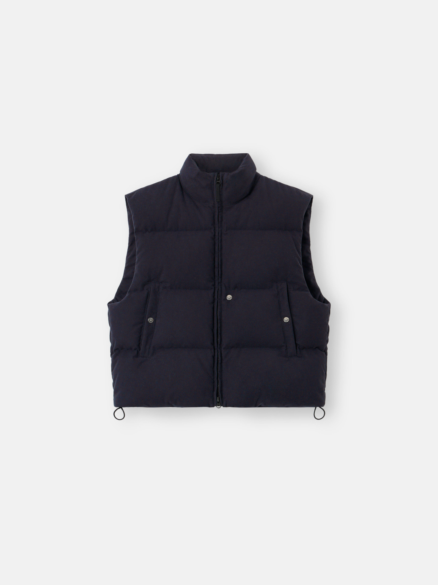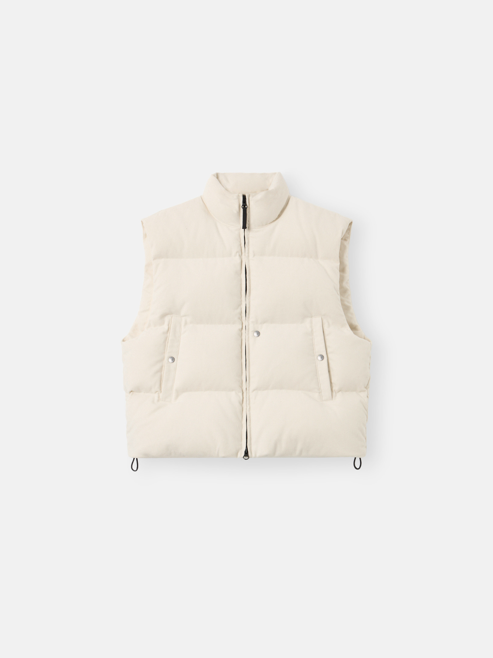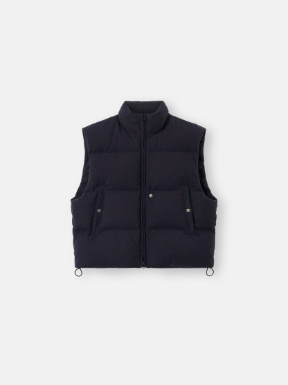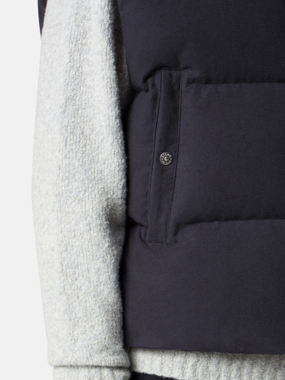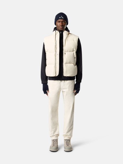 Down vest made from a cotton moleskin. The fabric's double-faced satin weave is brushed and sheared externally to achieve a warm and velvet-like hand. The fabric is resin-treated with a special anti-drop agent, making it wind resistant and mildly water resistant. RDS - Responsible Down Standard certified.