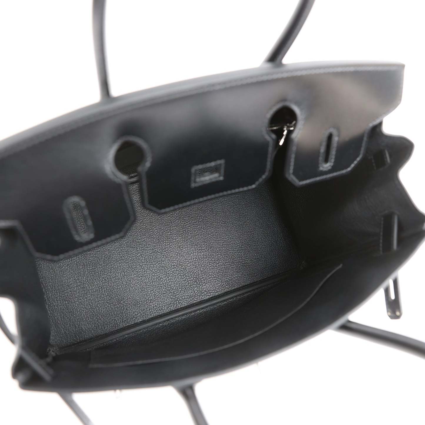 This Birkin is in Black Box calfskin leather with palladium hardware and has tonal stitching, front flap, two straps with center toggle closure, clochette with lock and two keys, and double rolled handles.