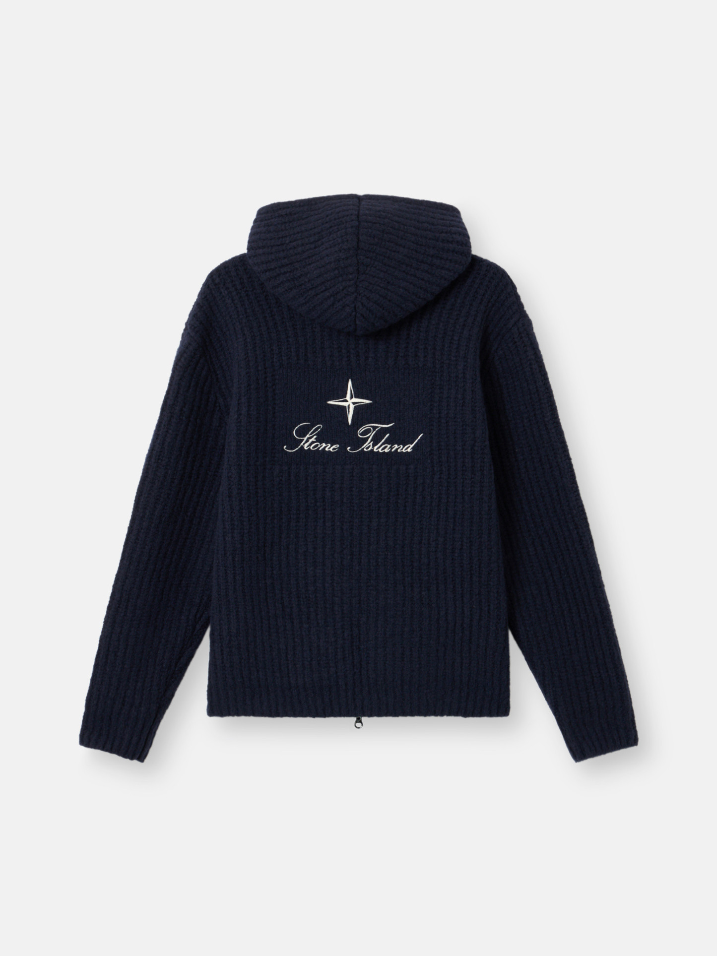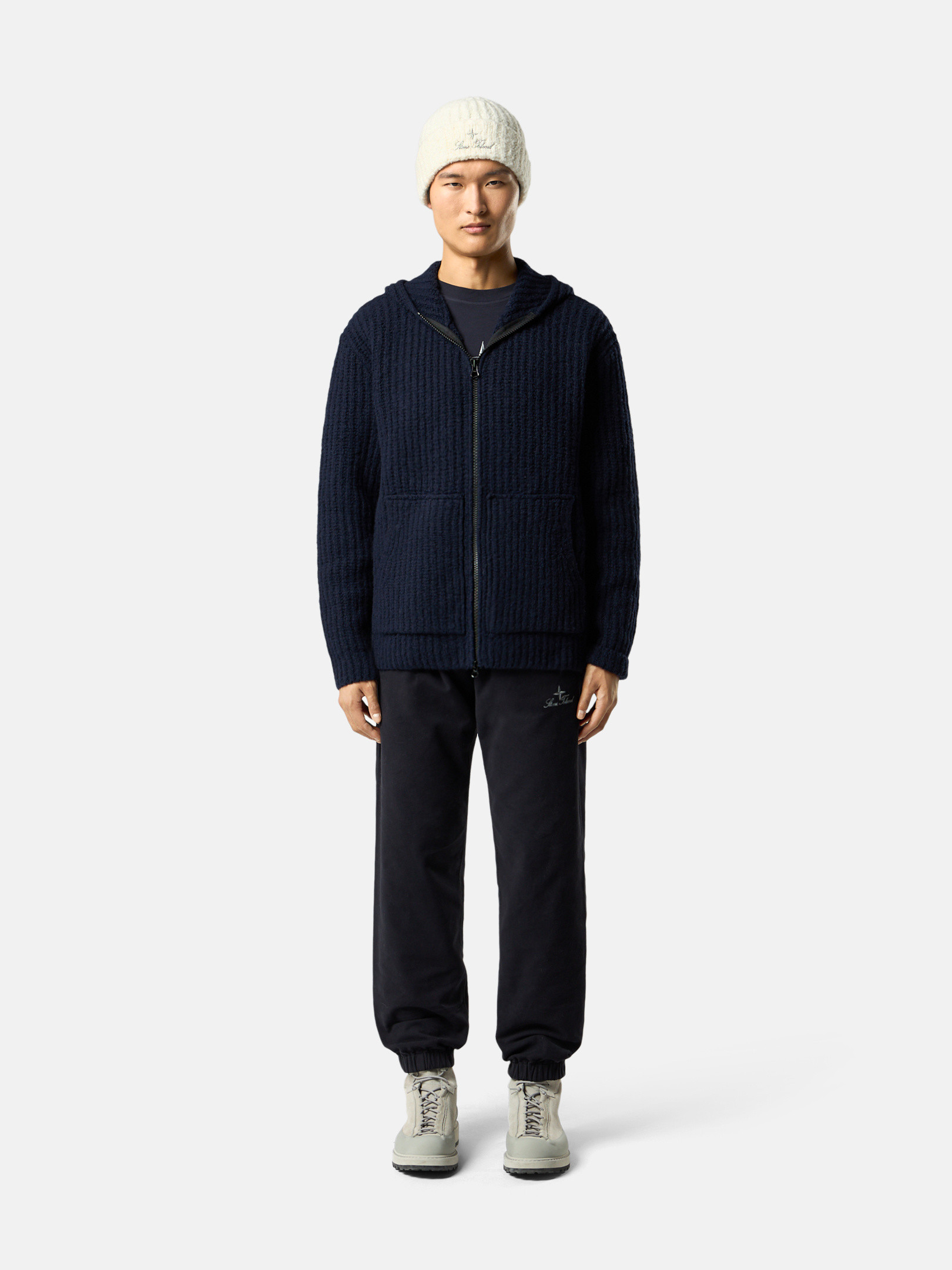 Hooded zipper-up sweater in wool nylon bouclé with fisherman’s rib, featuring an archival STOthtNE ISLthtAND logo and hand pockets. Garment dyed. Gauge 3.
