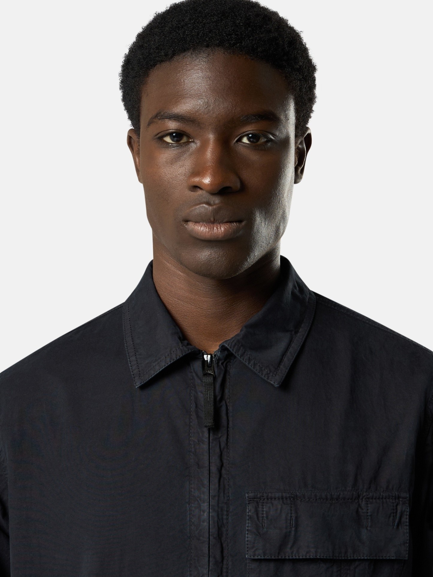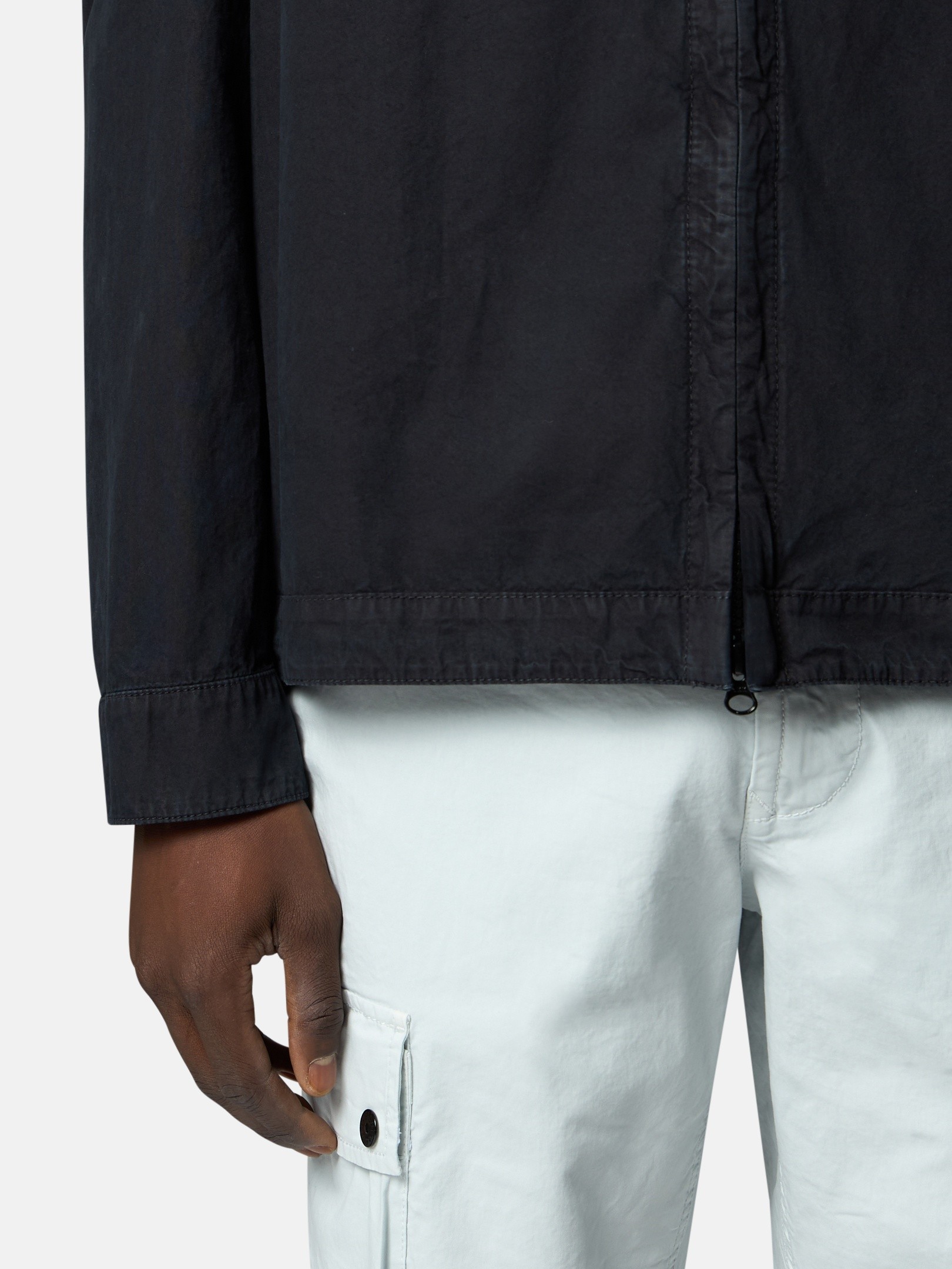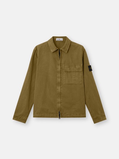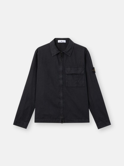 Overshirt in brushed organic cotton canvas, featuring a dual chest pocket and two-way zipper. Garment dyed with the “OLD” treatment for a slightly worn appearance.