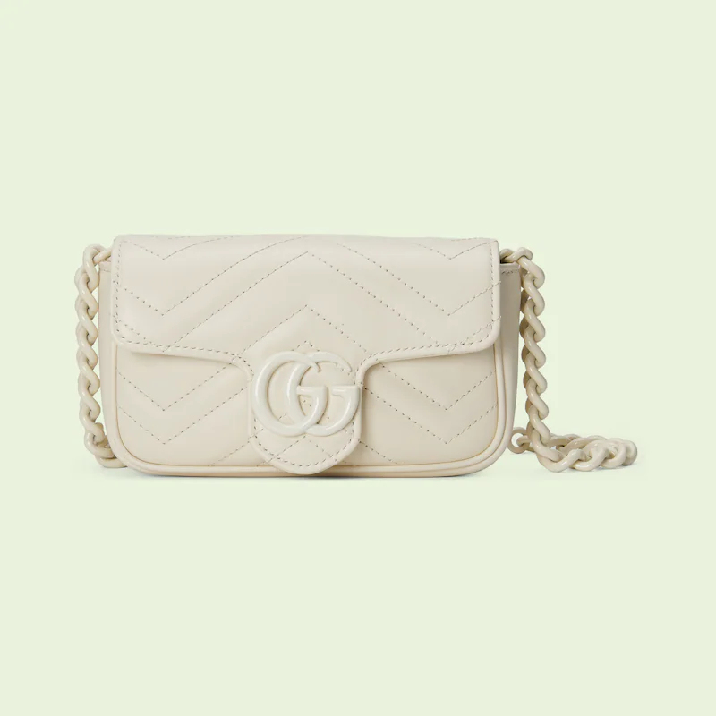 Accessories continue to come to the fore of the Creative Director's collections. A distinctly contemporary accessory, the belt bag is presented in new ways throughout the Guthtcci narrative, emphasizing different elements of the versatile style. Here, it is introduced as part of the GthtG Marmont universe in white chevron matelassé leather with a chain strap.